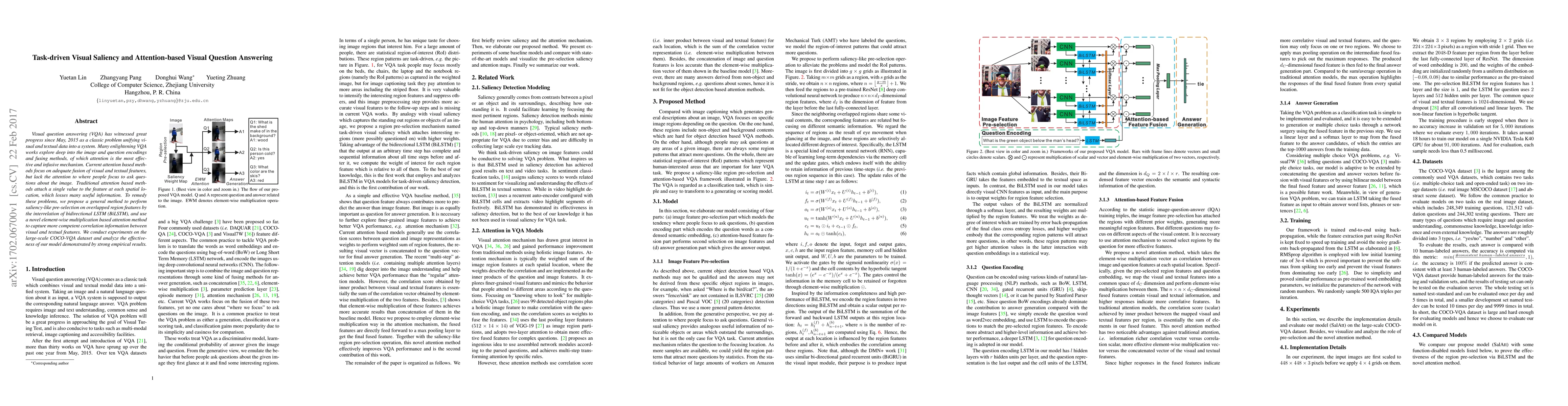 Visual question answering (VQA) has witnessed great progress since May, 2015 as a classic problem unifying visual and textual data into a system. Many enlightening VQA works explore deep into the image and question encodings and fusing methods, of which attention is the most effective and infusive mechanism. Current attention based methods focus on adequate fusion of visual and textual features, but lack the attention to where people focus to ask questions about the image. Traditional attention based methods attach a single value to the feature at each spatial location, which losses many useful information. To remedy these problems, we propose a general method to perform saliency-like pre-selection on overlapped region features by the interrelation of bidirectional LSTM (BiLSTM), and use a novel element-wise multiplication based attention method to capture more competent correlation information between visual and textual features. We conduct experiments on the large-scale COCO-VQA dataset and analyze the effectiveness of our model demonstrated by strong empirical results.