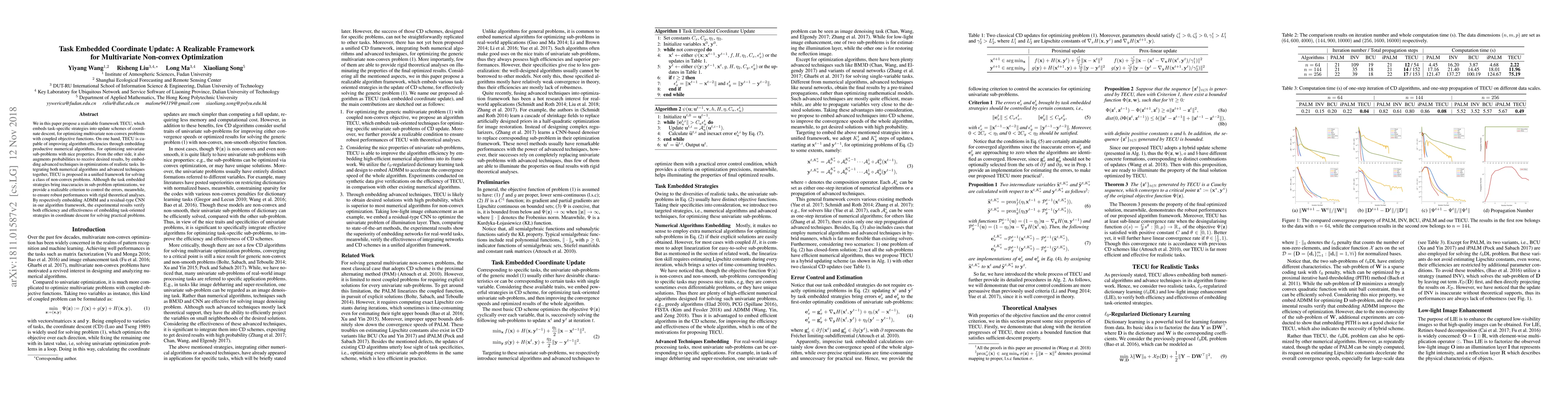 We in this paper propose a realizable framework TECU, which embeds task-specific strategies into update schemes of coordinate descent, for optimizing multivariate non-convex problems with coupled objective functions. On one hand, TECU is capable of improving algorithm efficiencies through embedding productive numerical algorithms, for optimizing univariate sub-problems with nice properties. From the other side, it also augments probabilities to receive desired results, by embedding advanced techniques in optimizations of realistic tasks. Integrating both numerical algorithms and advanced techniques together, TECU is proposed in a unified framework for solving a class of non-convex problems. Although the task embedded strategies bring inaccuracies in sub-problem optimizations, we provide a realizable criterion to control the errors, meanwhile, to ensure robust performances with rigid theoretical analyses. By respectively embedding ADMM and a residual-type CNN in our algorithm framework, the experimental results verify both efficiency and effectiveness of embedding task-oriented strategies in coordinate descent for solving practical problems.