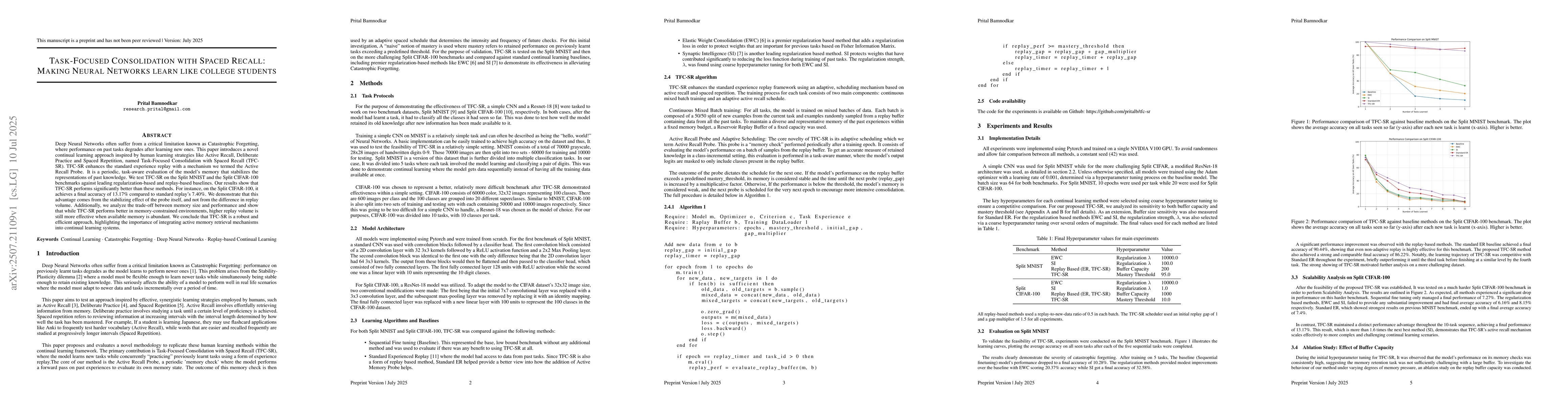 Deep Neural Networks often suffer from a critical limitation known as Catastrophic Forgetting, where performance on past tasks degrades after learning new ones. This paper introduces a novel continual learning approach inspired by human learning strategies like Active Recall, Deliberate Practice and Spaced Repetition, named Task Focused Consolidation with Spaced Recall (TFC-SR). TFC-SR enhances the standard experience replay with a mechanism we termed the Active Recall Probe. It is a periodic, task-aware evaluation of the model's memory that stabilizes the representations of past knowledge. We test TFC-SR on the Split MNIST and Split CIFAR-100 benchmarks against leading regularization-based and replay-based baselines. Our results show that TFC-SR performs significantly better than these methods. For instance, on the Split CIFAR-100, it achieves a final accuracy of 13.17% compared to standard replay's 7.40%. We demonstrate that this advantage comes from the stabilizing effect of the probe itself, and not from the difference in replay volume. Additionally, we analyze the trade-off between memory size and performance and show that while TFC-SR performs better in memory-constrained environments, higher replay volume is still more effective when available memory is abundant. We conclude that TFC-SR is a robust and efficient approach, highlighting the importance of integrating active memory retrieval mechanisms into continual learning systems.