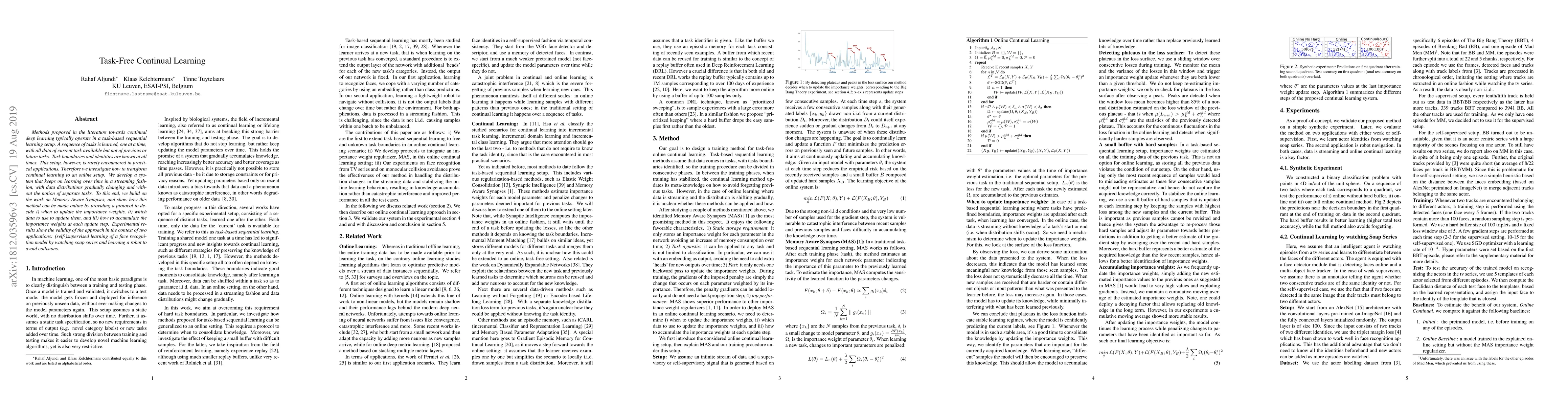 This paper proposes a method for task-free continual learning in an online setup, where the model learns continuously from streaming data without predefined tasks. It adapts the Memory Aware Synapses technique to dynamically update importance weights, demonstrating effectiveness in self-supervised face recognition and robot collision avoidance.