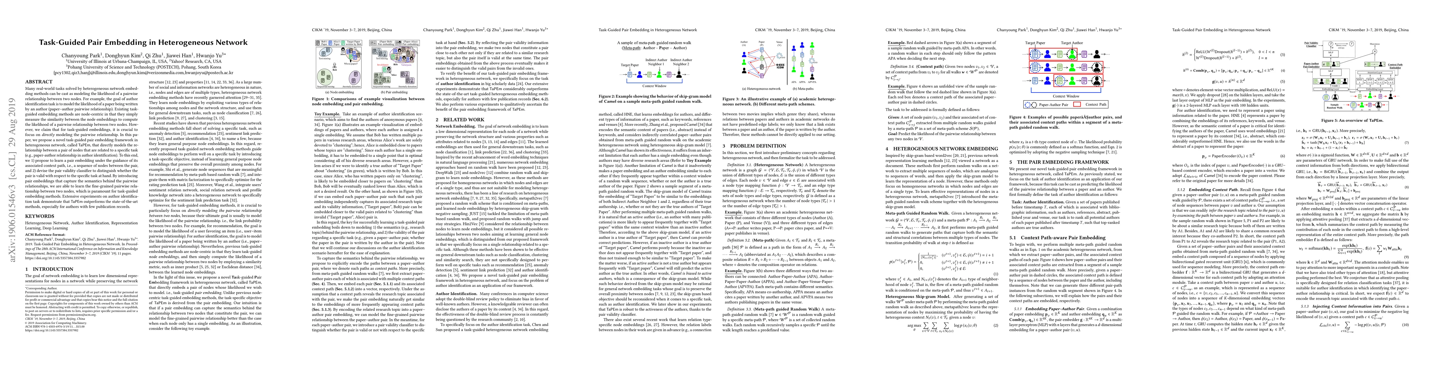 This paper introduces TaPEm, a novel task-guided pair embedding framework for heterogeneous networks, which directly models the pairwise relationships between nodes related to a specific task. It outperforms existing methods by learning pair embeddings guided by context path sequences and a pair validity classifier, demonstrating superior performance in author identification, especially for authors with limited publications.