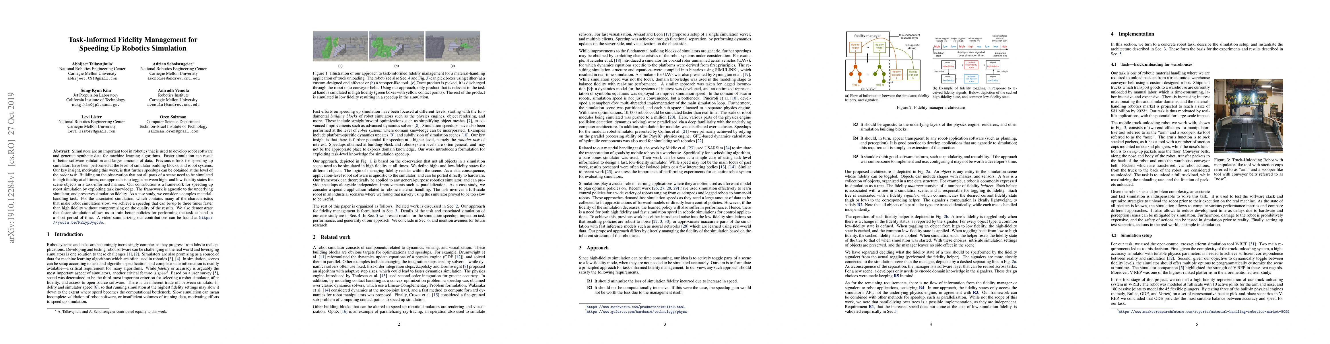This paper proposes a framework for speeding up robotics simulation by dynamically adjusting the fidelity of scene objects based on the specific robot task, achieving up to three times faster simulation without compromising fidelity. The approach leverages task knowledge to toggle between high and low fidelity, enabling better software validation and faster training of machine learning algorithms.
