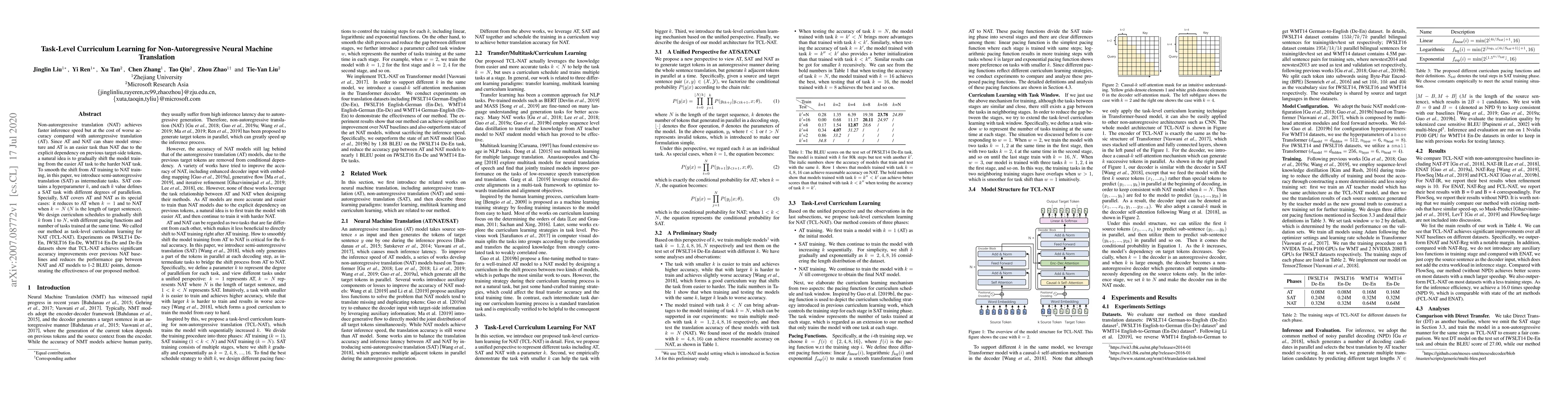 This paper proposes task-level curriculum learning for non-autoregressive neural machine translation (NAT) to improve accuracy. It introduces semi-autoregressive translation (SAT) as an intermediate task to bridge the gap between autoregressive translation (AT) and NAT, achieving significant accuracy improvements and reducing the performance gap between NAT and AT models.