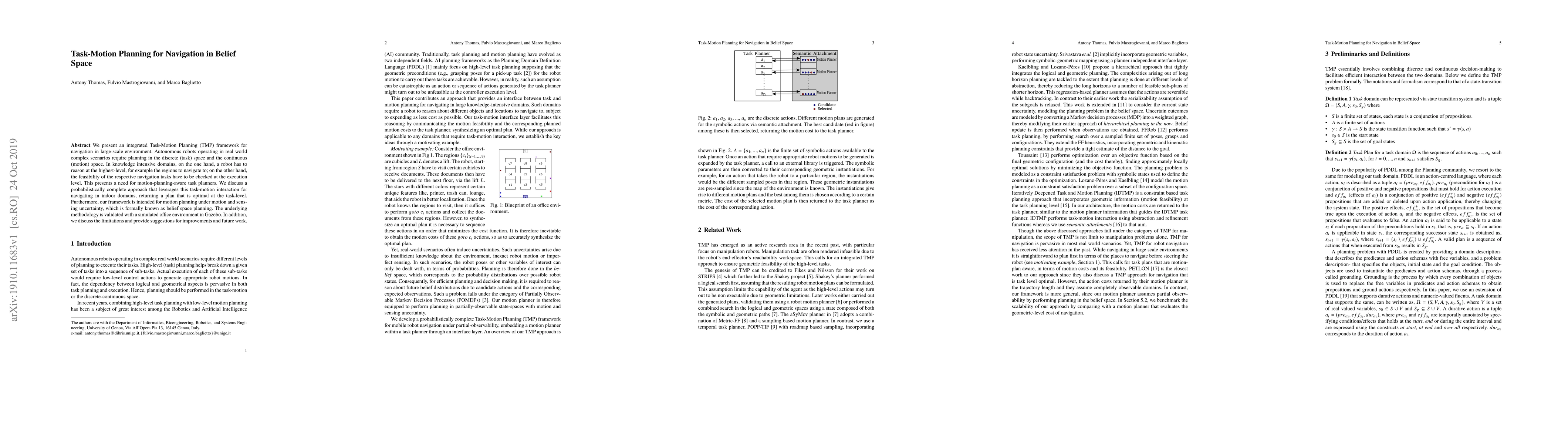 We present an integrated Task-Motion Planning (TMP) framework for navigation in large-scale environment. Autonomous robots operating in real world complex scenarios require planning in the discrete (task) space and the continuous (motion) space. In knowledge intensive domains, on the one hand, a robot has to reason at the highest-level, for example the regions to navigate to; on the other hand, the feasibility of the respective navigation tasks have to be checked at the execution level. This presents a need for motion-planning-aware task planners. We discuss a probabilistically complete approach that leverages this task-motion interaction for navigating in indoor domains, returning a plan that is optimal at the task-level. Furthermore, our framework is intended for motion planning under motion and sensing uncertainty, which is formally known as belief space planning. The underlying methodology is validated with a simulated office environment in Gazebo. In addition, we discuss the limitations and provide suggestions for improvements and future work.