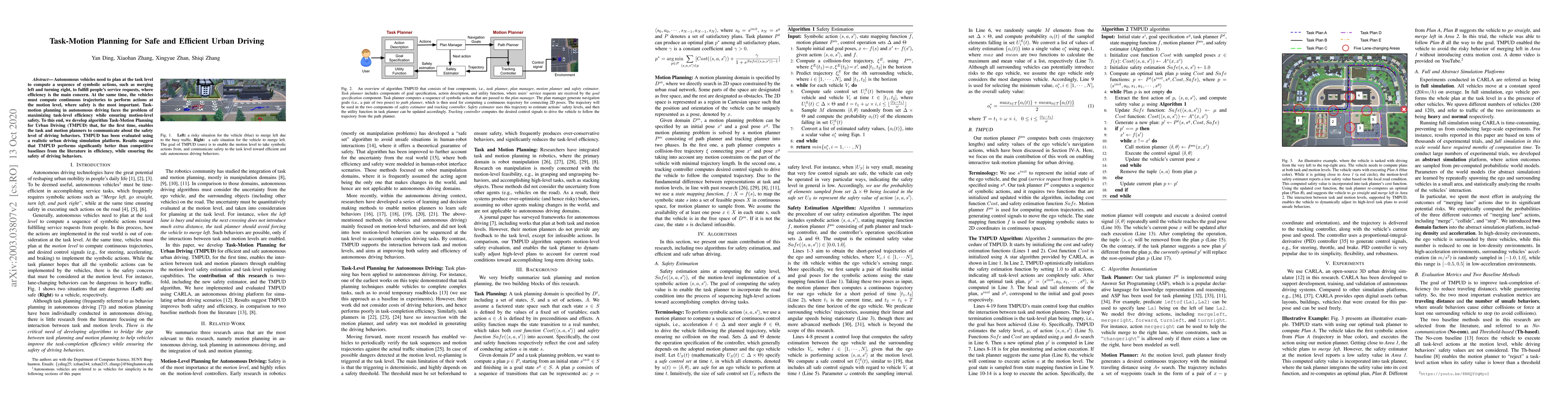 Autonomous vehicles need to plan at the task level to compute a sequence of symbolic actions, such as merging left and turning right, to fulfill people's service requests, where efficiency is the main concern. At the same time, the vehicles must compute continuous trajectories to perform actions at the motion level, where safety is the most important. Task-motion planning in autonomous driving faces the problem of maximizing task-level efficiency while ensuring motion-level safety. To this end, we develop algorithm Task-Motion Planning for Urban Driving (TMPUD) that, for the first time, enables the task and motion planners to communicate about the safety level of driving behaviors. TMPUD has been evaluated using a realistic urban driving simulation platform. Results suggest that TMPUD performs significantly better than competitive baselines from the literature in efficiency, while ensuring the safety of driving behaviors.