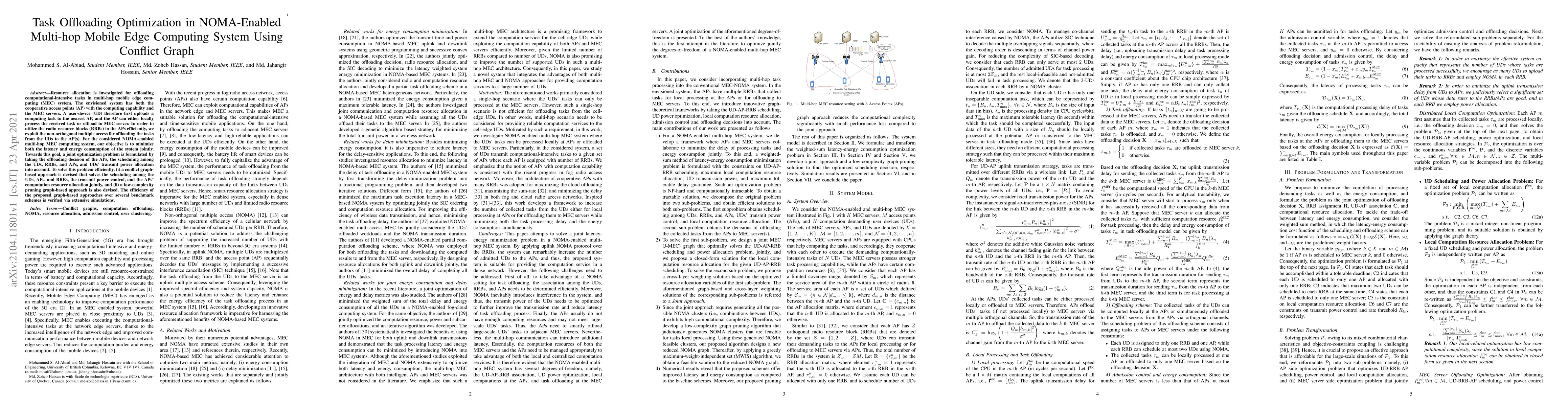 This paper investigates resource allocation for offloading tasks in a multi-hop mobile edge computing system using non-orthogonal multiple access (NOMA). It proposes a conflict graph-based approach to minimize latency and energy consumption by jointly optimizing scheduling, transmit power, and resource allocation. Simulation results show the efficiency of the proposed method over benchmark schemes.