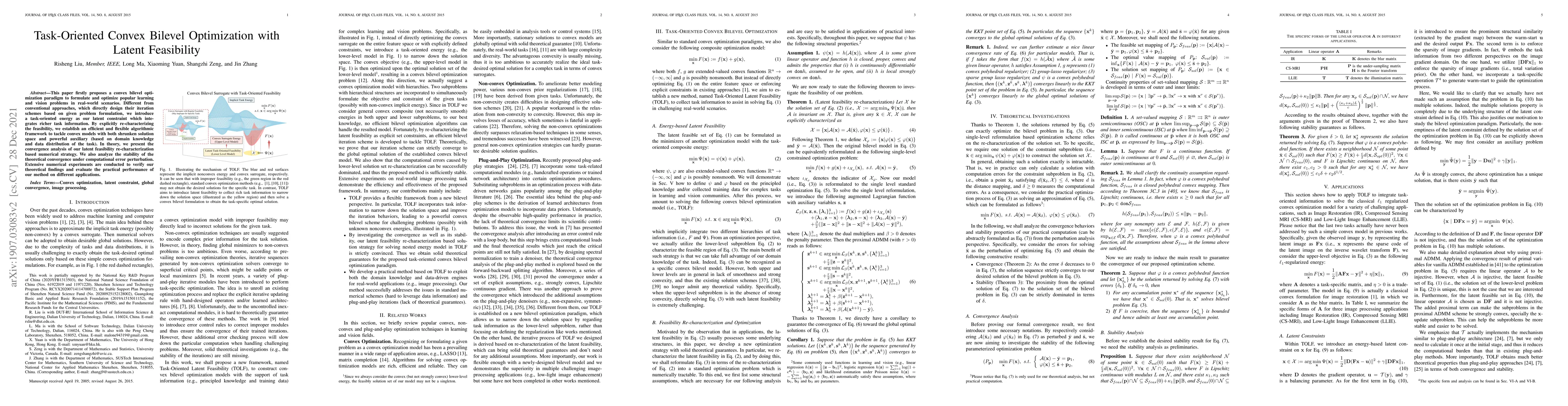 This paper firstly proposes a convex bilevel optimization paradigm to formulate and optimize popular learning and vision problems in real-world scenarios. Different from conventional approaches, which directly design their iteration schemes based on given problem formulation, we introduce a task-oriented energy as our latent constraint which integrates richer task information. By explicitly re-characterizing the feasibility, we establish an efficient and flexible algorithmic framework to tackle convex models with both shrunken solution space and powerful auxiliary (based on domain knowledge and data distribution of the task). In theory, we present the convergence analysis of our latent feasibility re-characterization based numerical strategy. We also analyze the stability of the theoretical convergence under computational error perturbation. Extensive numerical experiments are conducted to verify our theoretical findings and evaluate the practical performance of our method on different applications.
