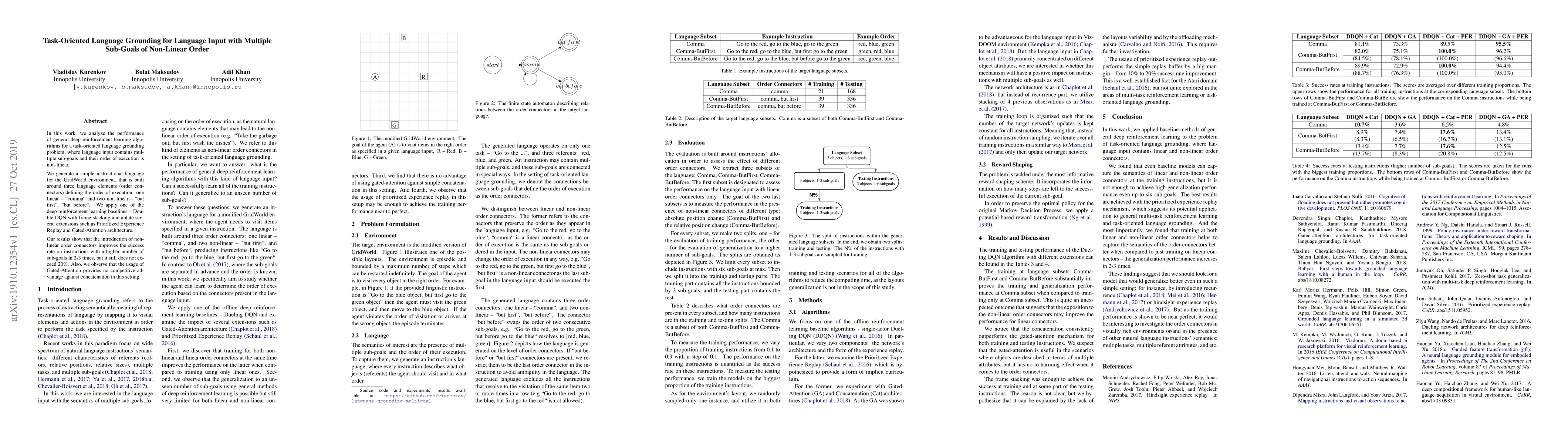 This paper investigates deep reinforcement learning for task-oriented language grounding in GridWorld, focusing on non-linear sub-goal orders. It finds that non-linear order connectors significantly improve success rates, though overall performance remains low.