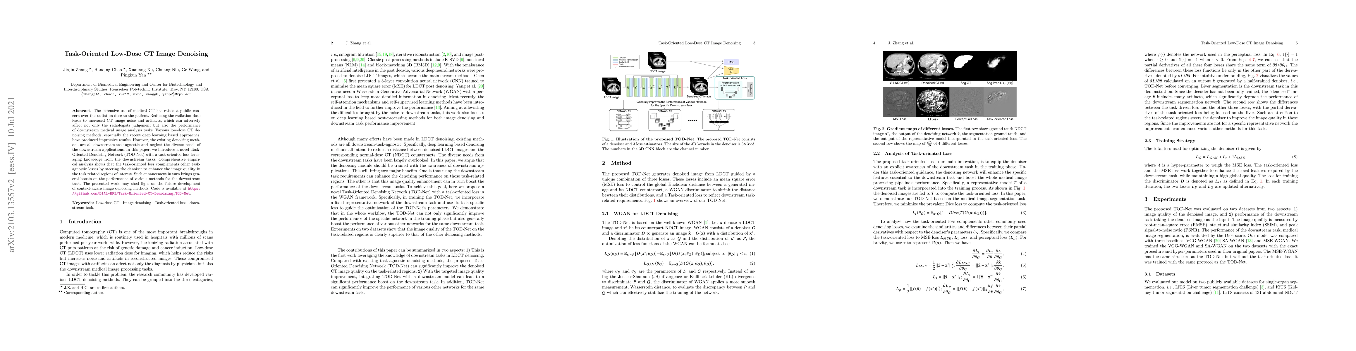This paper proposes a novel Task-Oriented Denoising Network (TOD-Net) that enhances low-dose CT image quality by incorporating task-specific loss functions, thereby improving the performance of downstream medical image analysis tasks. The task-oriented loss helps focus the denoiser on regions of interest, leading to better overall task performance.