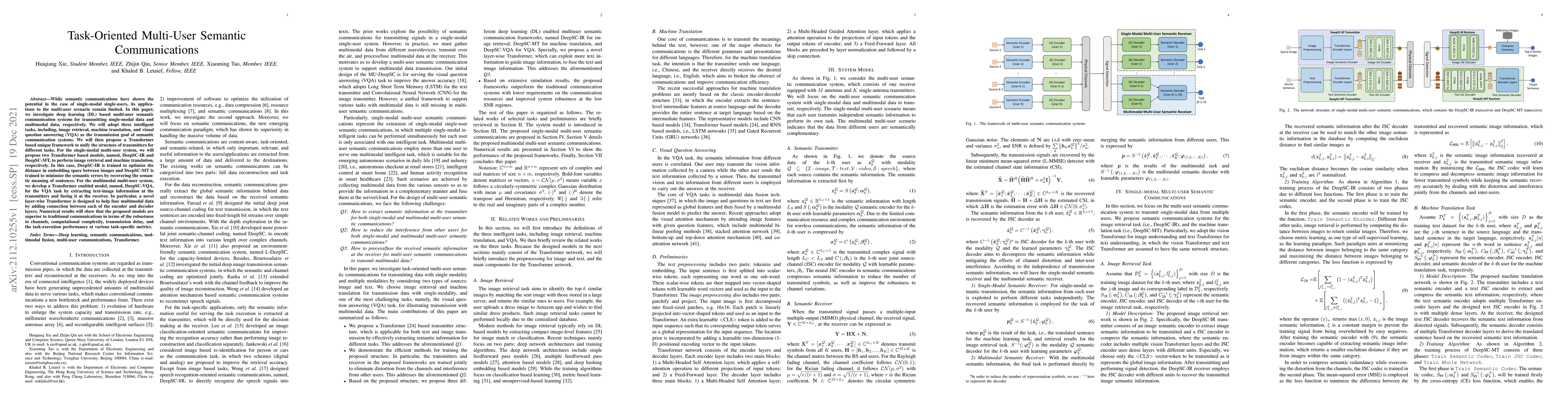 While semantic communications have shown the potential in the case of single-modal single-users, its applications to the multi-user scenario remain limited. In this paper, we investigate deep learning (DL) based multi-user semantic communication systems for transmitting single-modal data and multimodal data, respectively. We will adopt three intelligent tasks, including, image retrieval, machine translation, and visual question answering (VQA) as the transmission goal of semantic communication systems. We will then propose a Transformer based unique framework to unify the structure of transmitters for different tasks. For the single-modal multi-user system, we will propose two Transformer based models, named, DeepSC-IR and DeepSC-MT, to perform image retrieval and machine translation, respectively. In this case, DeepSC-IR is trained to optimize the distance in embedding space between images and DeepSC-MT is trained to minimize the semantic errors by recovering the semantic meaning of sentences. For the multimodal multi-user system, we develop a Transformer enabled model, named, DeepSC-VQA, for the VQA task by extracting text-image information at the transmitters and fusing it at the receiver. In particular, a novel layer-wise Transformer is designed to help fuse multimodal data by adding connection between each of the encoder and decoder layers. Numerical results will show that the proposed models are superior to traditional communications in terms of the robustness to channels, computational complexity, transmission delay, and the task-execution performance at various task-specific metrics.