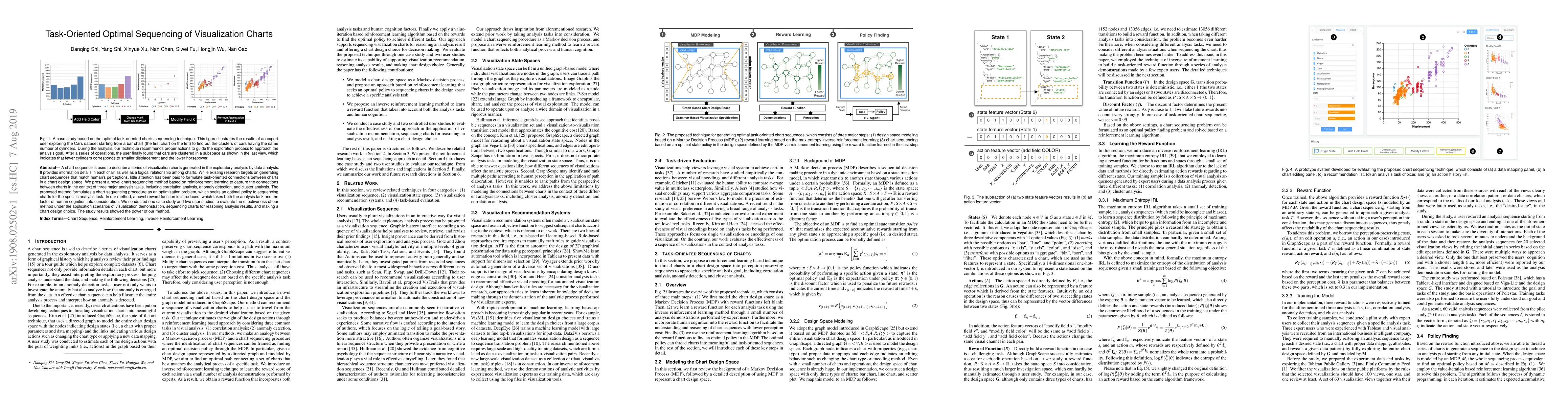 This paper proposes a reinforcement learning-based method for task-oriented sequencing of visualization charts, optimizing chart sequences for specific analysis tasks like correlation analysis and anomaly detection. The method incorporates a novel reward function considering both task relevance and human cognition, validated through case studies and user evaluations.