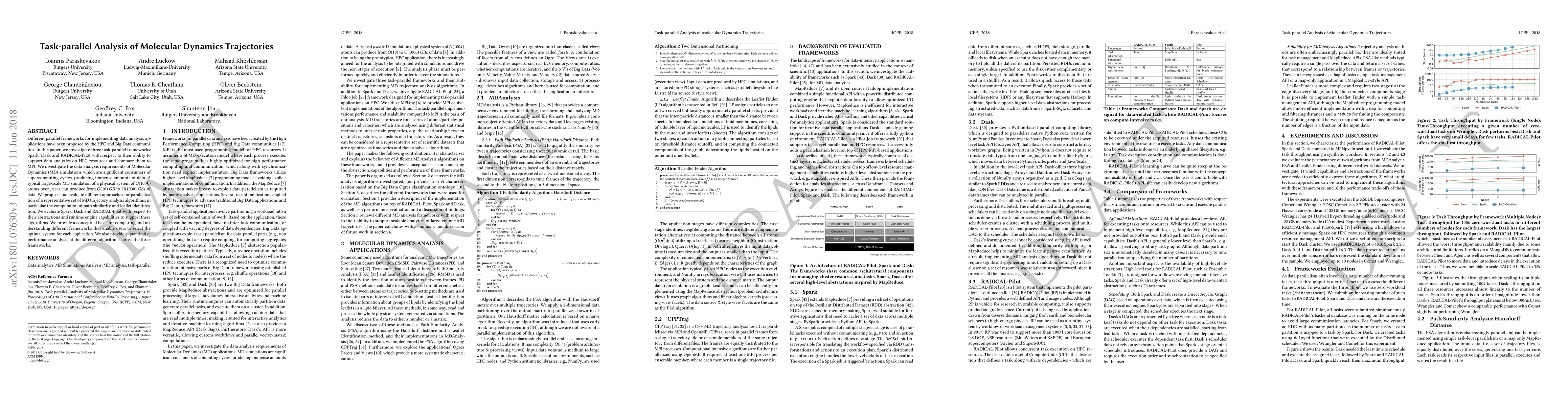 This paper evaluates three task-parallel frameworks—Spark, Dask, and RADICAL-Pilot—against MPI for analyzing large-scale molecular dynamics simulations, focusing on computational tasks like path similarity and leaflet identification. The study provides a comparative analysis of these frameworks to help users select the optimal system for specific data analytics applications.