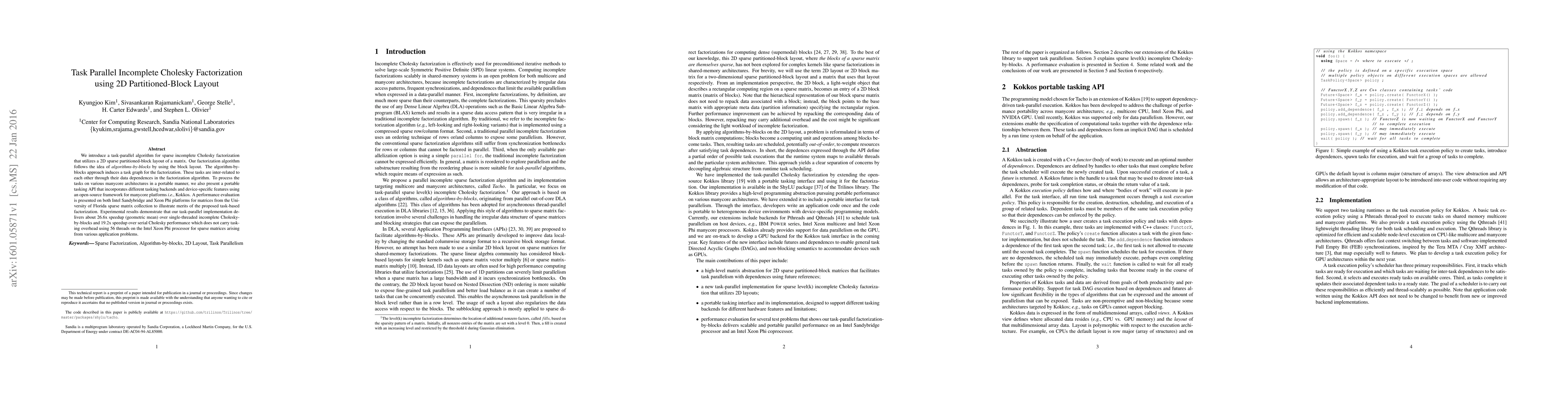 This paper proposes a task-parallel algorithm for sparse incomplete Cholesky factorization using a 2D partitioned-block layout, achieving significant speedups on manycore architectures. The algorithm leverages a portable tasking API within the Kokkos framework, demonstrating a 26.6x speedup over single-threaded implementations on Intel Xeon Phi.