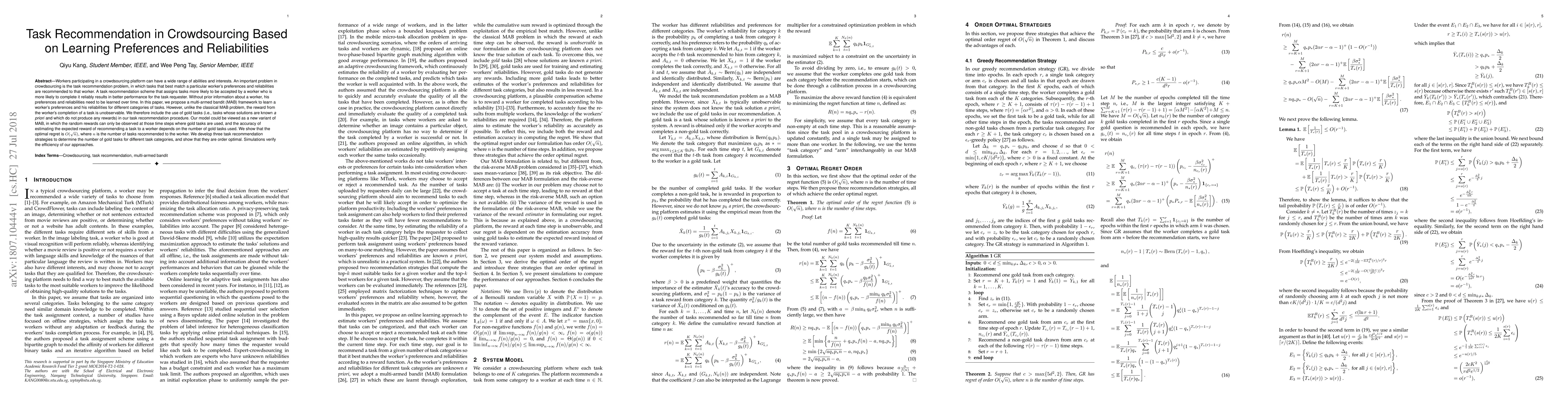 Workers participating in a crowdsourcing platform can have a wide range of abilities and interests. An important problem in crowdsourcing is the task recommendation problem, in which tasks that best match a particular worker's preferences and reliabilities are recommended to that worker. A task recommendation scheme that assigns tasks more likely to be accepted by a worker who is more likely to complete it reliably results in better performance for the task requester. Without prior information about a worker, his preferences and reliabilities need to be learned over time. In this paper, we propose a multi-armed bandit (MAB) framework to learn a worker's preferences and his reliabilities for different categories of tasks. However, unlike the classical MAB problem, the reward from the worker's completion of a task is unobservable. We therefore include the use of gold tasks (i.e., tasks whose solutions are known \emph{a priori} and which do not produce any rewards) in our task recommendation procedure. Our model could be viewed as a new variant of MAB, in which the random rewards can only be observed at those time steps where gold tasks are used, and the accuracy of estimating the expected reward of recommending a task to a worker depends on the number of gold tasks used. We show that the optimal regret is $O(\sqrt{n})$, where $n$ is the number of tasks recommended to the worker. We develop three task recommendation strategies to determine the number of gold tasks for different task categories, and show that they are order optimal. Simulations verify the efficiency of our approaches.