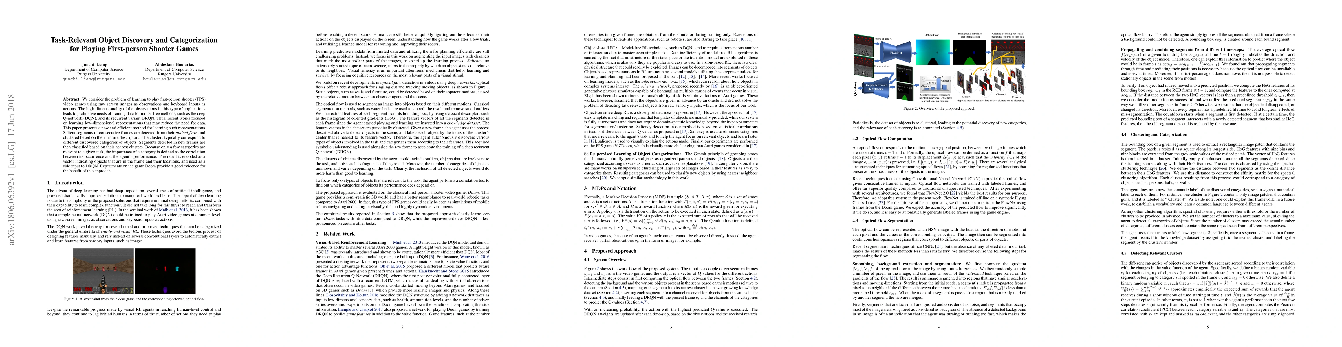 This paper proposes an efficient method for discovering and categorizing task-relevant objects in first-person shooter games using optical flow and clustering. The approach reduces training data needs by focusing on important categories correlated with performance, enhancing the deep recurrent Q-network (DRQN) with the resulting object representation.