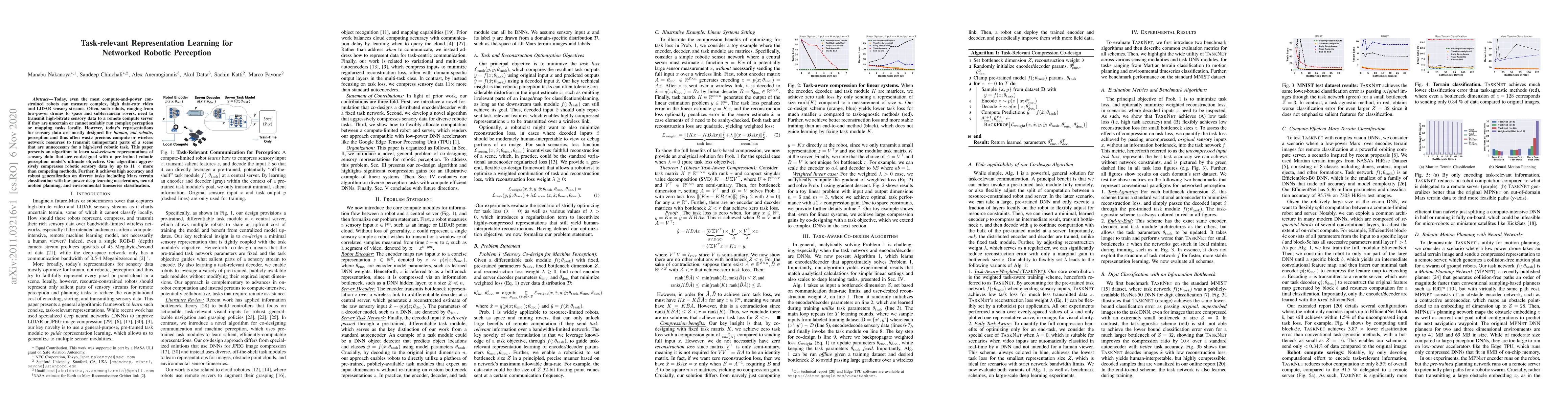 Today, even the most compute-and-power constrained robots can measure complex, high data-rate video and LIDAR sensory streams. Often, such robots, ranging from low-power drones to space and subterranean rovers, need to transmit high-bitrate sensory data to a remote compute server if they are uncertain or cannot scalably run complex perception or mapping tasks locally. However, today's representations for sensory data are mostly designed for human, not robotic, perception and thus often waste precious compute or wireless network resources to transmit unimportant parts of a scene that are unnecessary for a high-level robotic task. This paper presents an algorithm to learn task-relevant representations of sensory data that are co-designed with a pre-trained robotic perception model's ultimate objective. Our algorithm aggressively compresses robotic sensory data by up to 11x more than competing methods. Further, it achieves high accuracy and robust generalization on diverse tasks including Mars terrain classification with low-power deep learning accelerators, neural motion planning, and environmental timeseries classification.