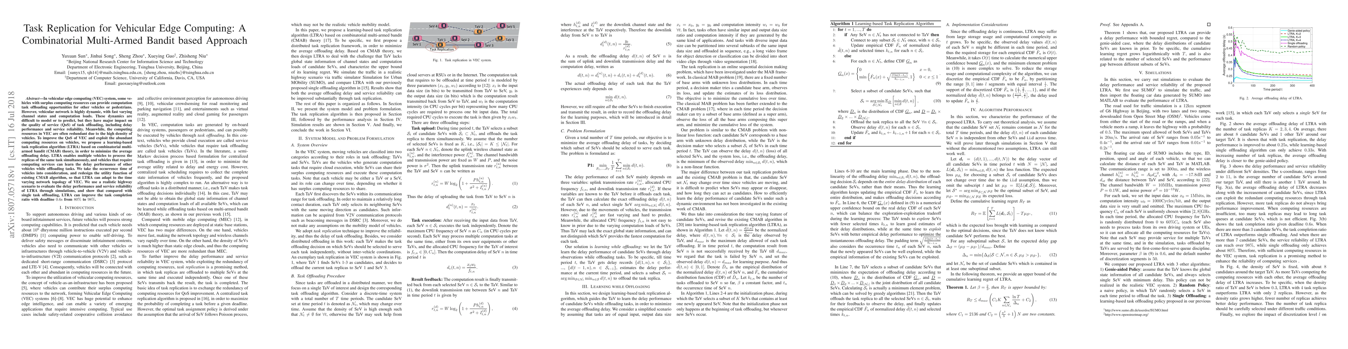 This paper proposes a learning-based task replication algorithm (LTRA) for vehicular edge computing (VEC) using combinatorial multi-armed bandit (CMAB) theory to minimize offloading delay. LTRA enables multiple vehicles to process task replicas simultaneously, improving QoS and adapting to dynamic network conditions. Simulation results show LTRA enhances task completion ratio significantly compared to single task offloading.