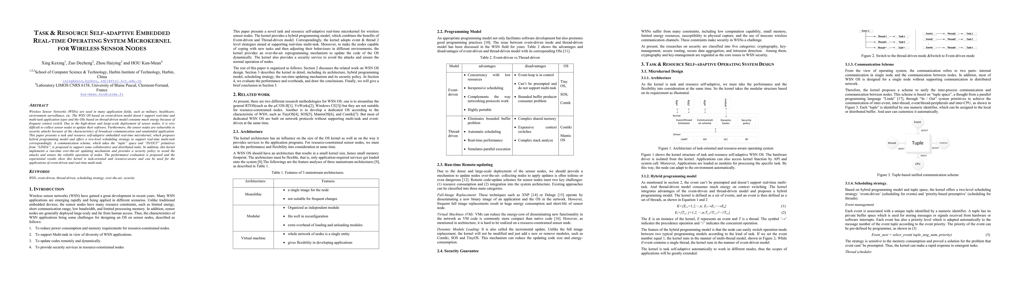 This paper introduces a self-adaptive embedded real-time microkernel for wireless sensor nodes, featuring a hybrid programming model and a two-level scheduling strategy to support real-time multi-task applications. It also includes a secure communication scheme and a run-time over-the-air updating mechanism for enhanced reliability and security.