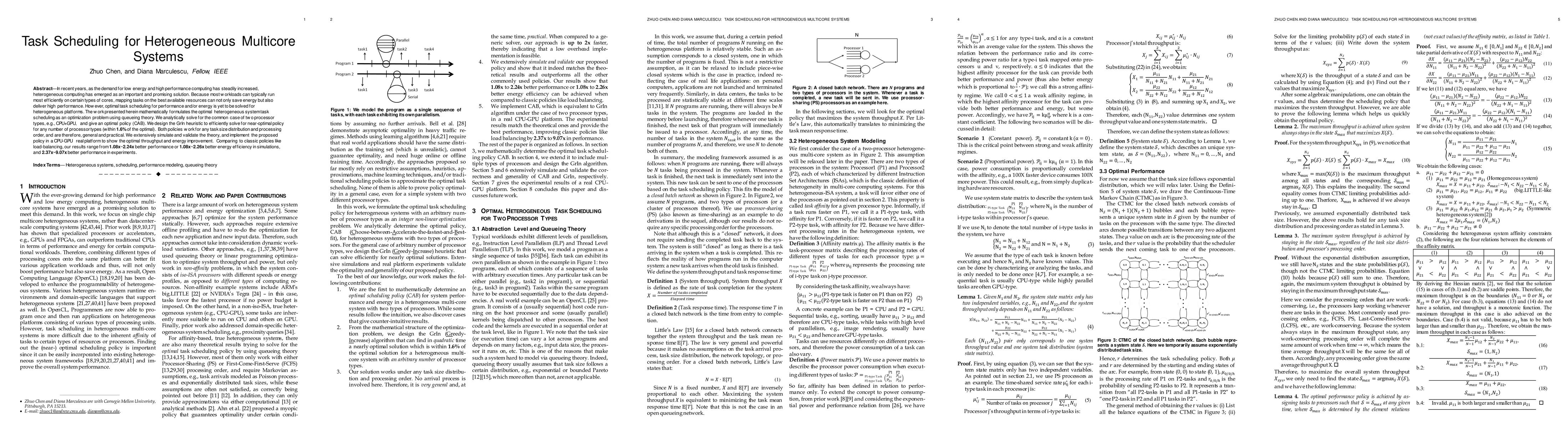 This paper formulates optimal task scheduling for heterogeneous multicore systems as an optimization problem, presenting an optimal policy (CAB) and a near-optimal heuristic (GrIn) for efficient scheduling. Experimental results show significant improvements in performance and energy efficiency compared to traditional load-balancing methods.