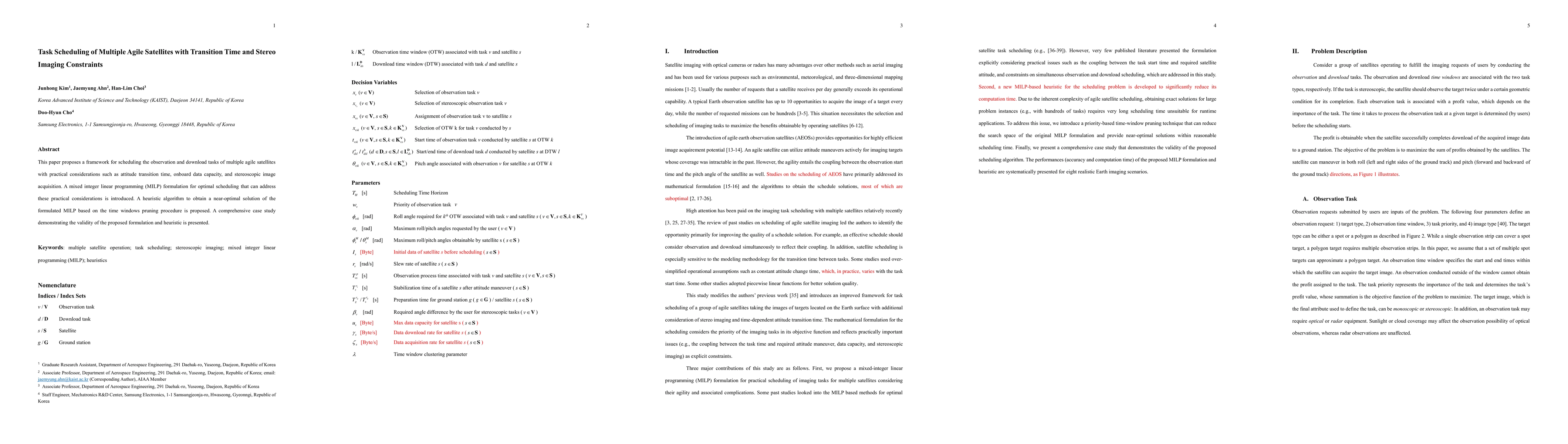 This paper introduces a mixed integer linear programming framework for scheduling agile satellites' observation and download tasks, considering transition time and stereoscopic imaging constraints. A heuristic algorithm based on time windows pruning is proposed for near-optimal solutions, validated through a comprehensive case study.