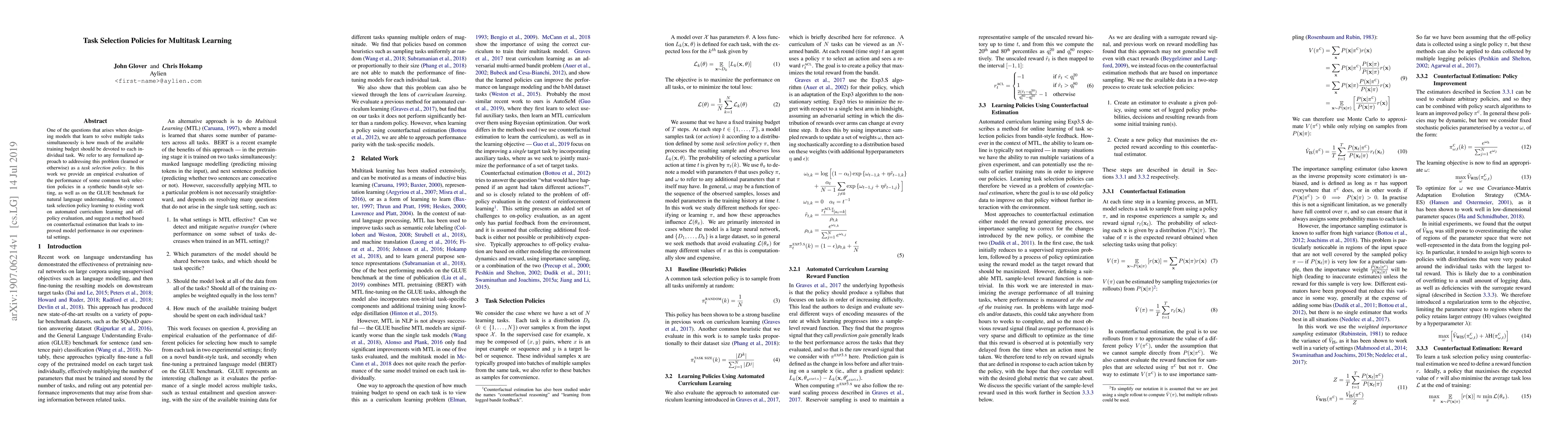 One of the questions that arises when designing models that learn to solve multiple tasks simultaneously is how much of the available training budget should be devoted to each individual task. We refer to any formalized approach to addressing this problem (learned or otherwise) as a task selection policy. In this work we provide an empirical evaluation of the performance of some common task selection policies in a synthetic bandit-style setting, as well as on the GLUE benchmark for natural language understanding. We connect task selection policy learning to existing work on automated curriculum learning and off-policy evaluation, and suggest a method based on counterfactual estimation that leads to improved model performance in our experimental settings.