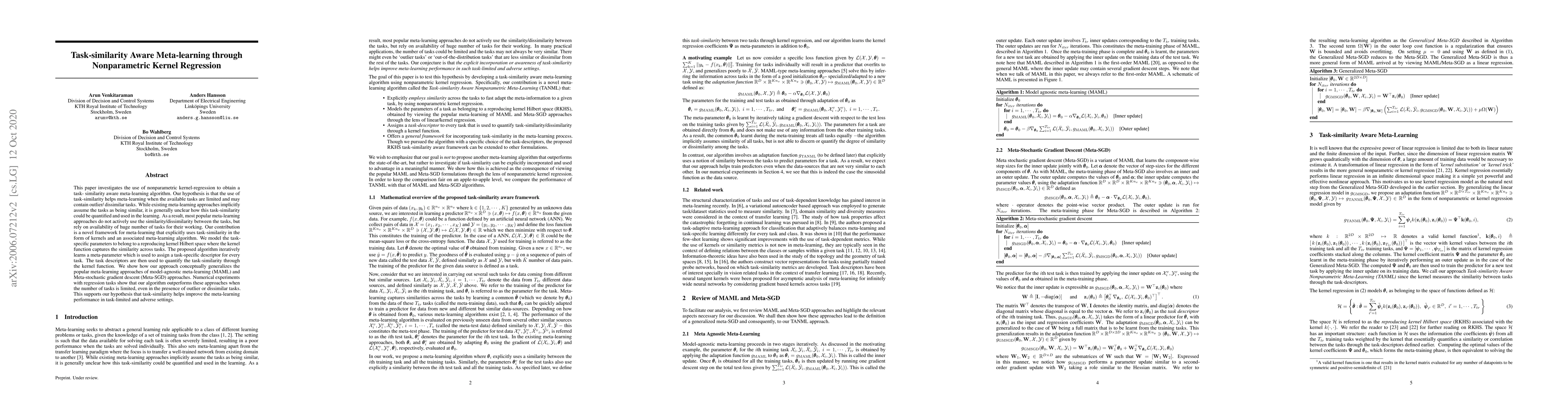 This paper investigates the use of nonparametric kernel-regression to obtain a tasksimilarity aware meta-learning algorithm. Our hypothesis is that the use of tasksimilarity helps meta-learning when the available tasks are limited and may contain outlier/ dissimilar tasks. While existing meta-learning approaches implicitly assume the tasks as being similar, it is generally unclear how this task-similarity could be quantified and used in the learning. As a result, most popular metalearning approaches do not actively use the similarity/dissimilarity between the tasks, but rely on availability of huge number of tasks for their working. Our contribution is a novel framework for meta-learning that explicitly uses task-similarity in the form of kernels and an associated meta-learning algorithm. We model the task-specific parameters to belong to a reproducing kernel Hilbert space where the kernel function captures the similarity across tasks. The proposed algorithm iteratively learns a meta-parameter which is used to assign a task-specific descriptor for every task. The task descriptors are then used to quantify the task-similarity through the kernel function. We show how our approach conceptually generalizes the popular meta-learning approaches of model-agnostic meta-learning (MAML) and Meta-stochastic gradient descent (Meta-SGD) approaches. Numerical experiments with regression tasks show that our algorithm outperforms these approaches when the number of tasks is limited, even in the presence of outlier or dissimilar tasks. This supports our hypothesis that task-similarity helps improve the metalearning performance in task-limited and adverse settings.