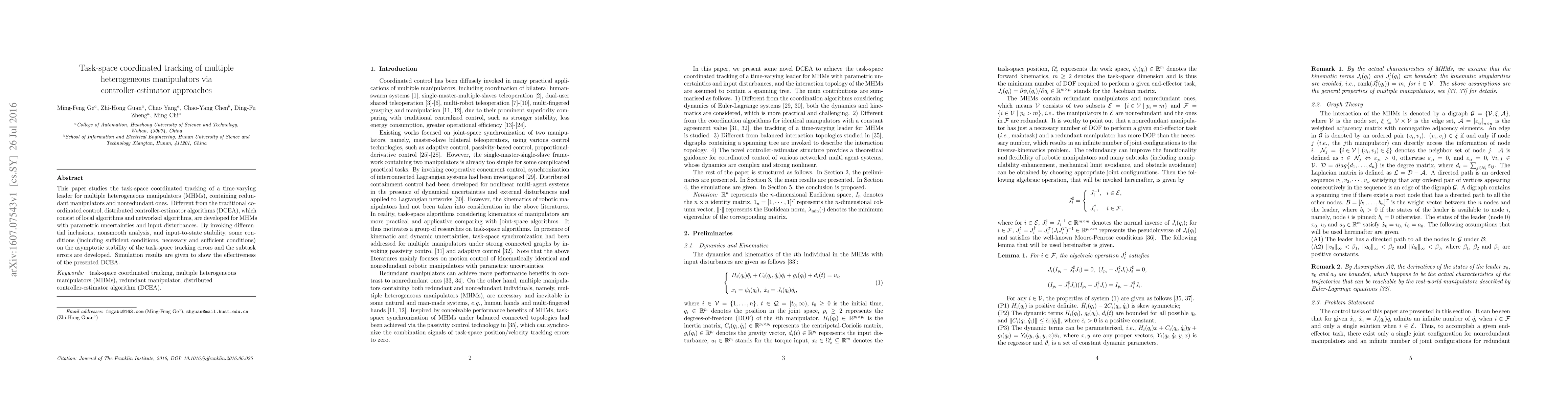 This paper studies the task-space coordinated tracking of a time-varying leader for multiple heterogeneous manipulators (MHMs), containing redundant manipulators and nonredundant ones. Different from the traditional coordinated control, distributed controller-estimator algorithms (DCEA), which consist of local algorithms and networked algorithms, are developed for MHMs with parametric uncertainties and input disturbances. By invoking differential inclusions, nonsmooth analysis, and input-to-state stability, some conditions (including sufficient conditions, necessary and sufficient conditions) on the asymptotic stability of the task-space tracking errors and the subtask errors are developed. Simulation results are given to show the effectiveness of the presented DCEA.