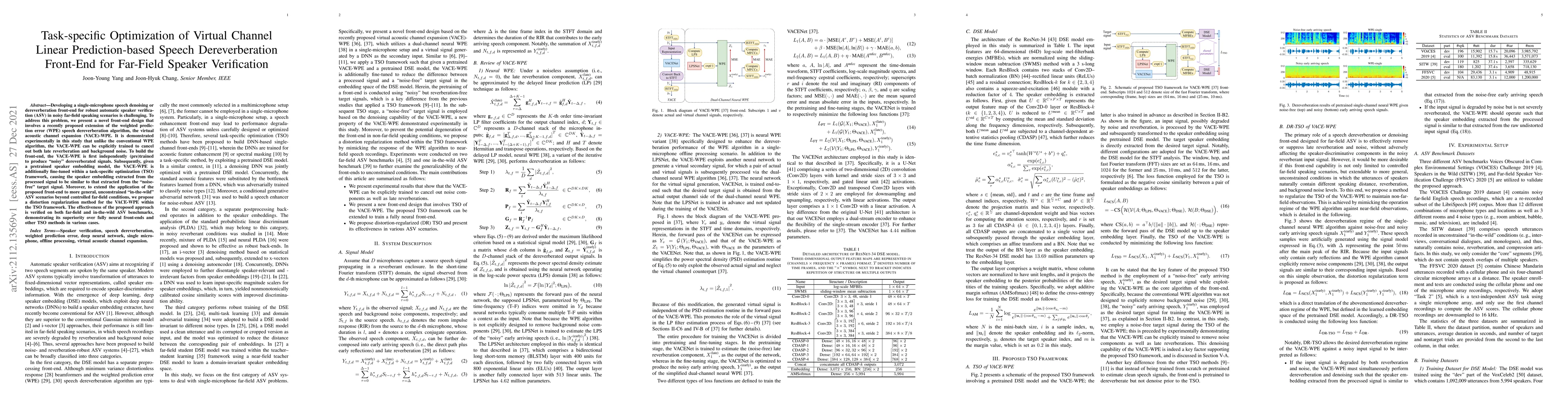 This paper proposes a novel virtual acoustic channel expansion (VACE)-weighted prediction error (WPE) speech dereverberation front-end optimized for far-field speaker verification. The VACE-WPE is fine-tuned within a task-specific optimization framework to enhance speaker embedding consistency, showing superior performance over neural front-ends and other methods in both controlled and unconstrained environments.