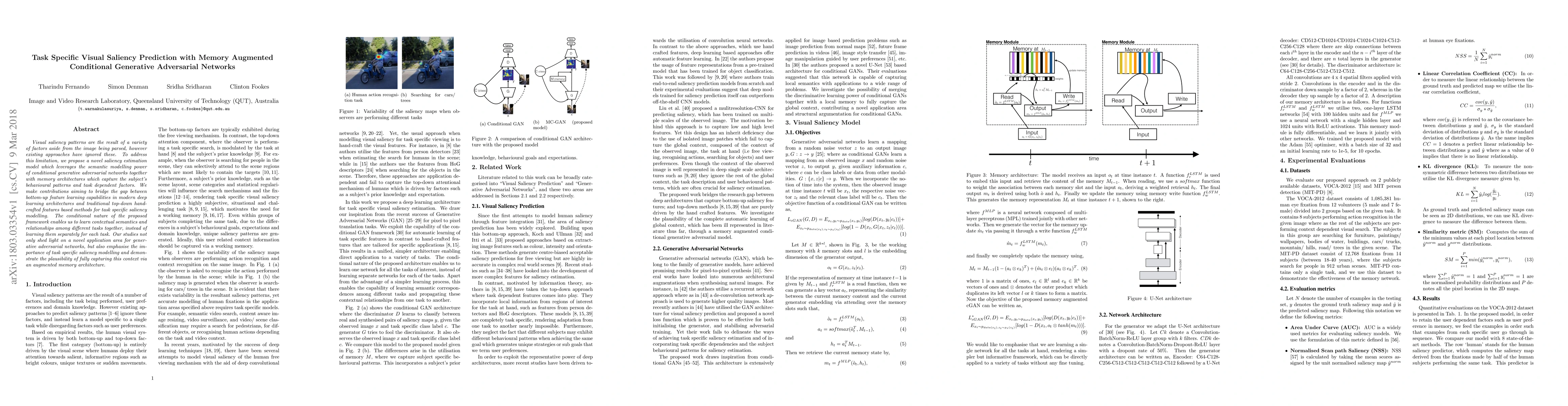 This paper proposes a novel visual saliency prediction model using memory-augmented conditional generative adversarial networks to incorporate task-specific factors and behavioral patterns. The approach aims to bridge bottom-up deep learning and top-down feature-based methods for better task-specific saliency estimation.