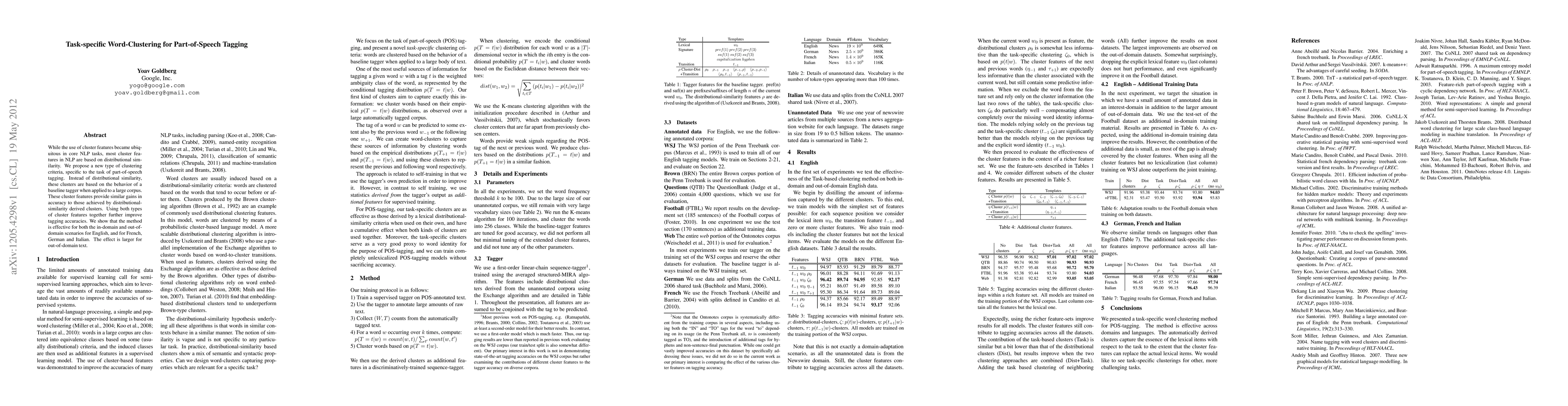 This paper proposes a novel clustering method for part-of-speech tagging based on the behavior of a baseline tagger rather than distributional similarity. Combining these task-specific clusters with traditional distributional clusters further enhances tagging accuracy across multiple languages.