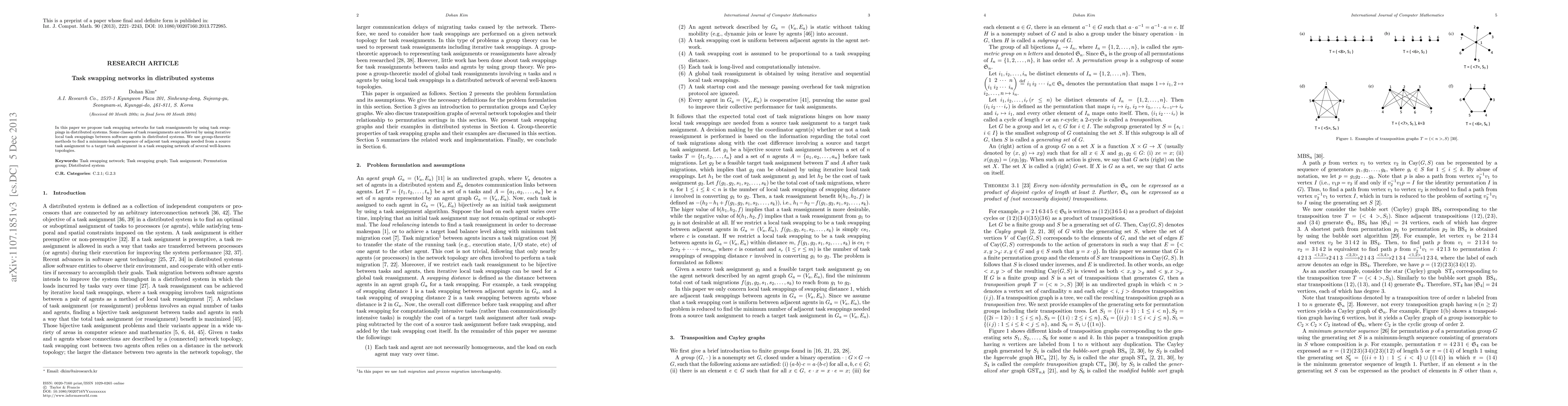 This paper proposes task swapping networks to efficiently reassign tasks in distributed systems by finding minimum-length sequences of local task swaps between software agents. It uses group-theoretic methods to optimize task reassignment paths.