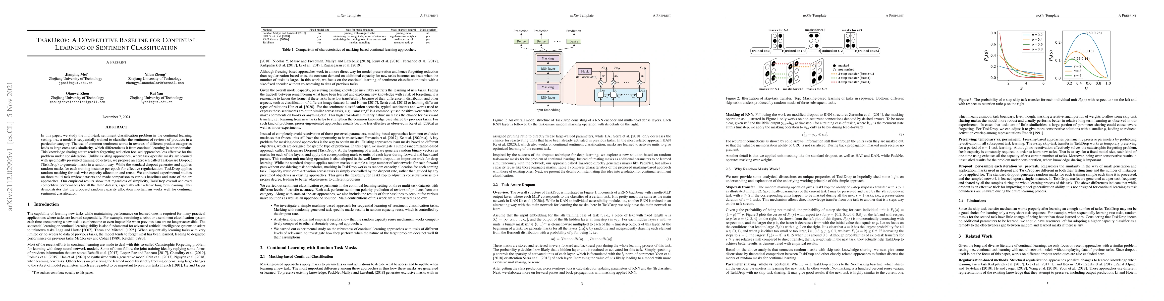 The paper introduces TaskDrop, a novel approach for continual learning in multi-task sentiment classification, which uses random masking for task-wise capacity allocation. Experimental results show that TaskDrop achieves competitive performance across three datasets, demonstrating its effectiveness in reducing forgetting in sentiment classification.