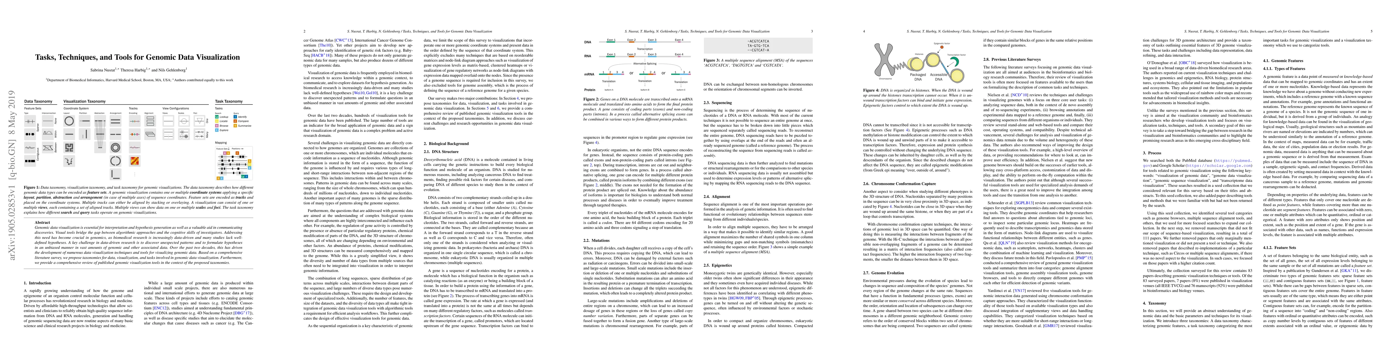 This paper surveys genomic data visualization techniques and tools, proposing taxonomies for data, visualization methods, and tasks involved. It reviews existing tools in the context of these taxonomies, aiming to bridge algorithmic approaches with investigators' cognitive skills.