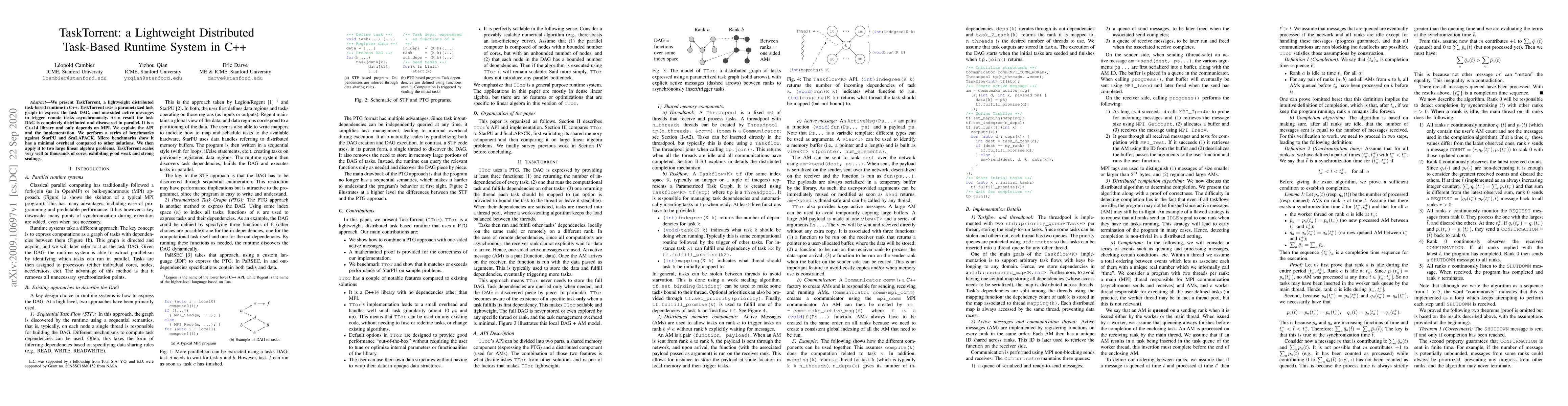 TaskTorrent is a lightweight C++14 distributed runtime system for task-based parallelism, utilizing a parametrized task graph and one-sided active messages for asynchronous task triggering. Benchmarks show minimal overhead and excellent scalability to thousands of cores, outperforming StarPU and ScaLAPACK in linear algebra tasks.