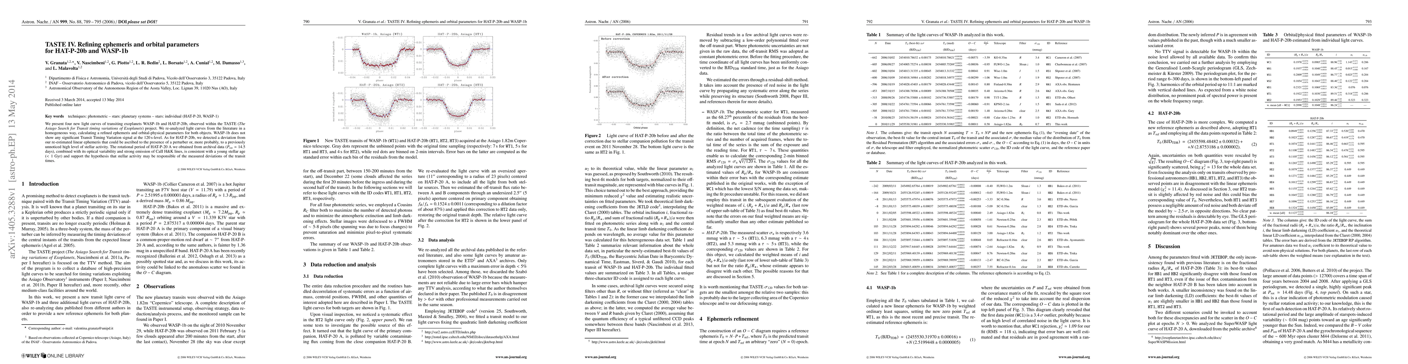 We present four new light curves of transiting exoplanets WASP-1b and HAT-P-20b, observed within the TASTE (The Asiago Search for Transit timing variations of Exoplanets) project. We re-analyzed light curves from the literature in a homogeneous way, calculating a refined ephemeris and orbital-physical parameters for both objects. WASP-1b does not show any significant Transit Timing Variation signal at the 120 s-level. As for HAT-P-20b, we detected a deviation from our re-estimated linear ephemeris that could be ascribed to the presence of a perturber or, more probably, to a previously unnoticed high level of stellar activity. The rotational period of HAT-P-20 A we obtained from archival data (P_rot ~ 14.5 days), combined with its optical variability and strong emission of CaII H&K lines, is consistent with a young stellar age (< 1 Gyr) and support the hypothesis that stellar activity may be responsible of the measured deviations of the transit times.