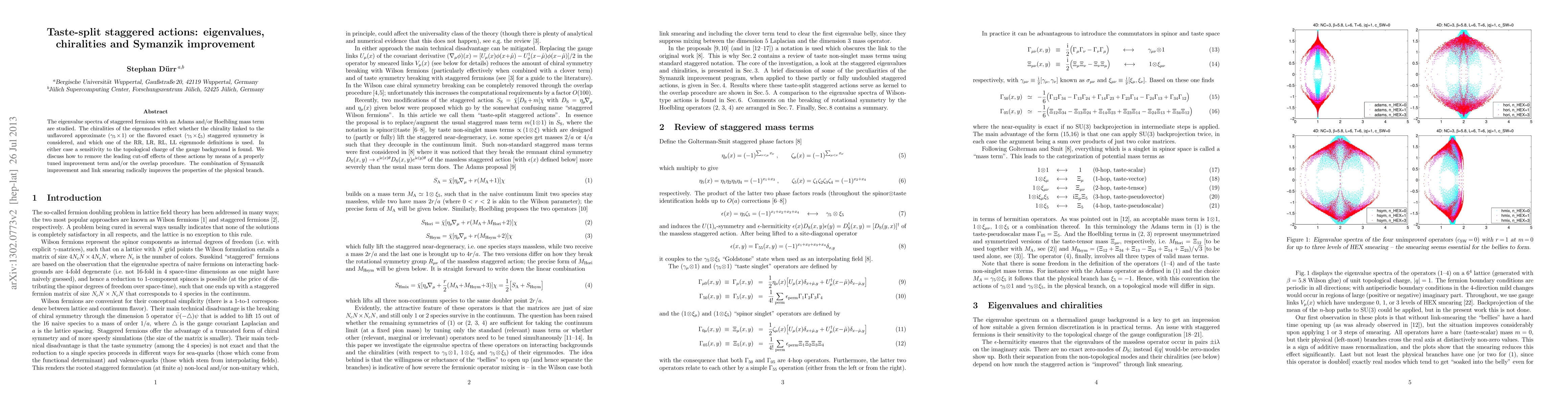 The eigenvalue spectra of staggered fermions with an Adams and/or Hoelbling mass term are studied. The chiralities of the eigenmodes reflect whether the chirality linked to the unflavored approximate (\gamma_5 \times 1) or the flavored exact (\gamma_5 \times \xi_5) staggered symmetry is considered, and which one of the RR, LR, RL, LL eigenmode definitions is used. In either case a sensitivity to the topological charge of the gauge background is found. We discuss how to remove the leading cut-off effects of these actions by means of a properly tuned improvement term and/or the overlap procedure. The combination of Symanzik improvement and link smearing radically improves the properties of the physical branch.