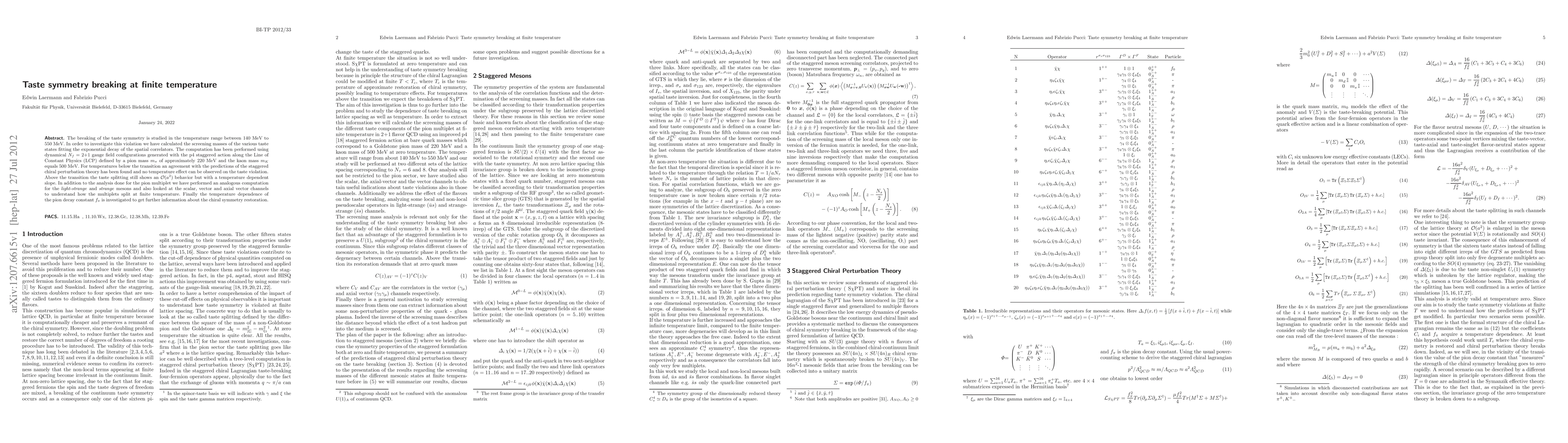 This study investigates taste symmetry breaking at finite temperatures (140 MeV to 550 MeV) using dynamical Nf = 2+1 gauge configurations. It finds no temperature effect on taste violation below the transition, but an O(a^2) behavior with temperature-dependent slope above the transition. The analysis covers pion, light-strange, and strange meson multiplets in scalar, vector, and axial vector channels. The paper also examines the temperature dependence of the pion decay constant for chiral symmetry restoration insights.