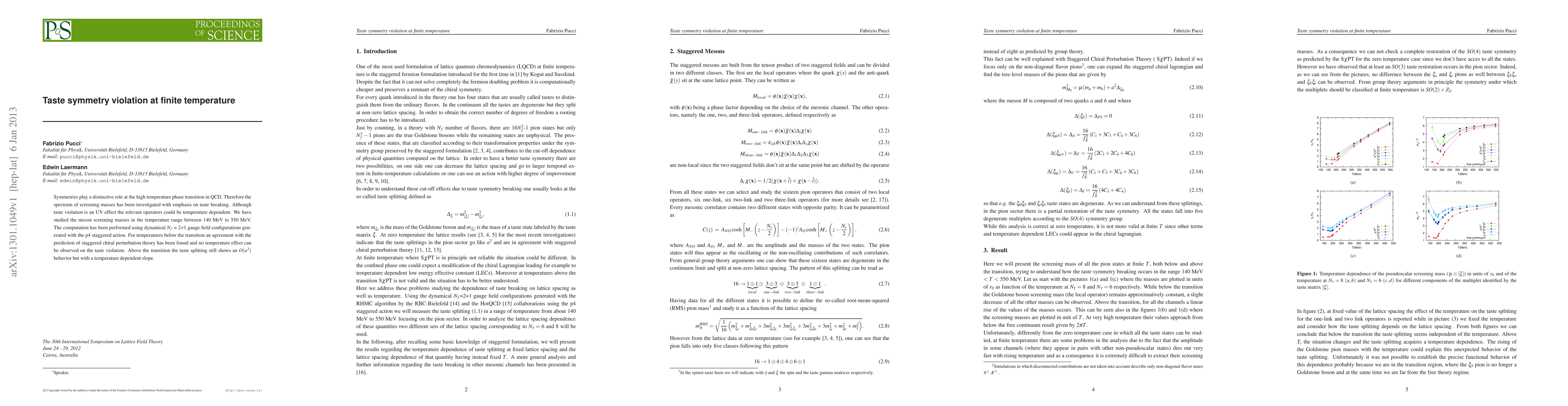 Symmetries play a distinctive role at the high temperature phase transition in QCD. Therefore the spectrum of screening masses has been investigated with emphasis on taste breaking. Although taste violation is an UV effect the relevant operators could be temperature dependent. We have studied the meson screening masses in the temperature range between 140 MeV to 550 MeV. The computation has been performed using dynamical N_f = 2+1 gauge field configurations generated with the p4 staggered action. For temperatures below the transition an agreement with the prediction of staggered chiral perturbation theory has been found and no temperature effect can be observed on the taste violation. Above the transition the taste splitting still shows an O(a^2) behavior but with a temperature dependent slope.