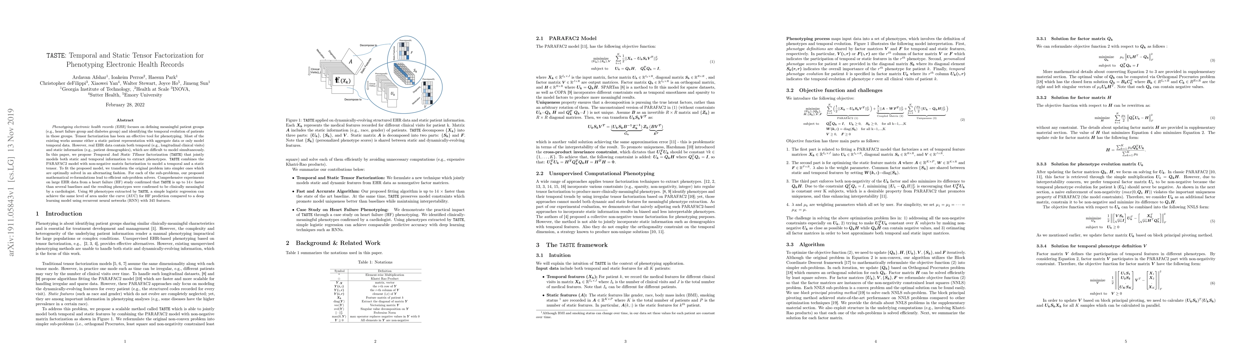 The paper proposes TASTE, a novel Temporal And Static Tensor factorization method for phenotyping electronic health records (EHR), which jointly models both temporal and static patient data. Experiments show TASTE is significantly faster than baselines and extracts clinically meaningful phenotypes, achieving comparable predictive performance to deep learning models.