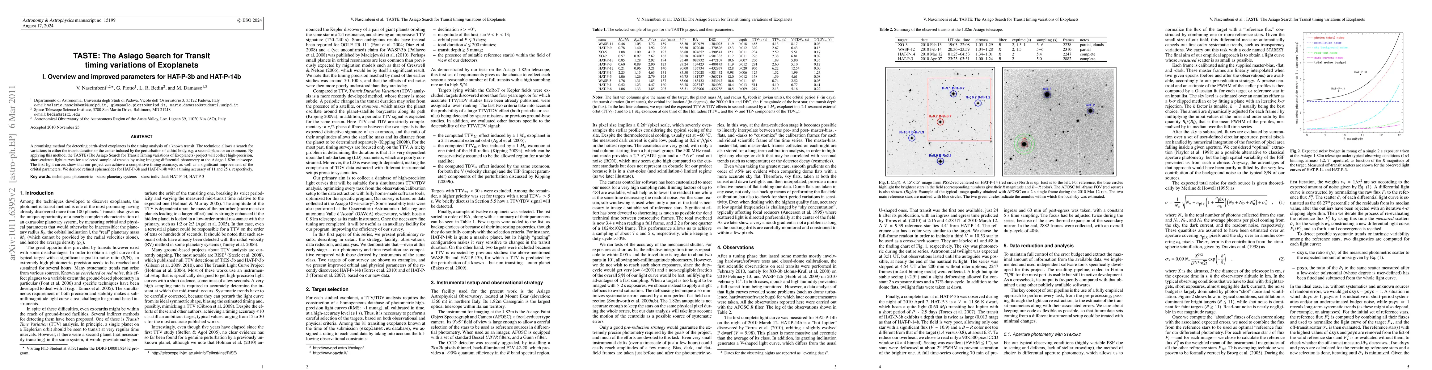 The TASTE project aims to detect earth-sized exoplanets by analyzing transit timing variations. Initial light curves from the Asiago 1.82m telescope reveal refined orbital parameters and improved timing accuracies for HAT-P-3b and HAT-P-14b, achieving 11 and 25 seconds precision, respectively.