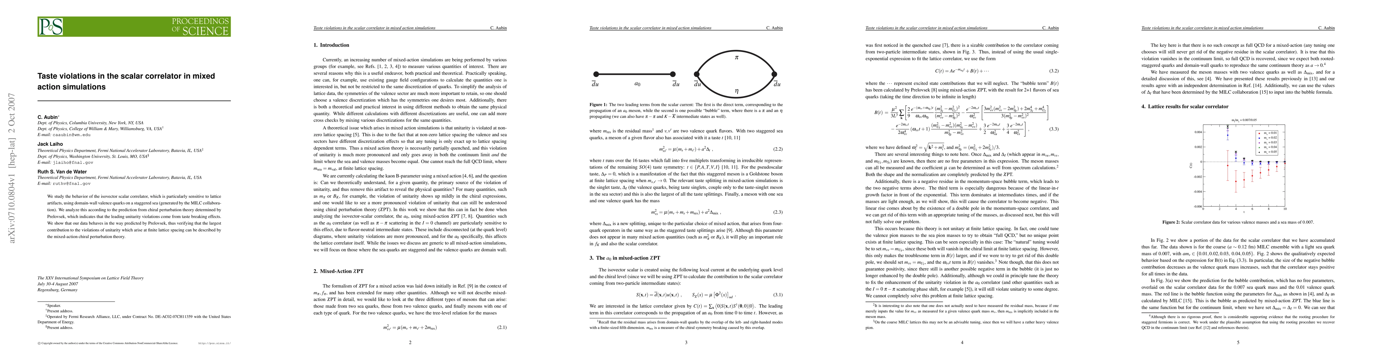 This paper investigates the isovector scalar correlator's behavior in mixed-action simulations, revealing significant lattice artifacts. The study confirms that taste violations, predicted by Prelovsek's chiral perturbation theory, are the primary source of unitarity violations at finite lattice spacing.