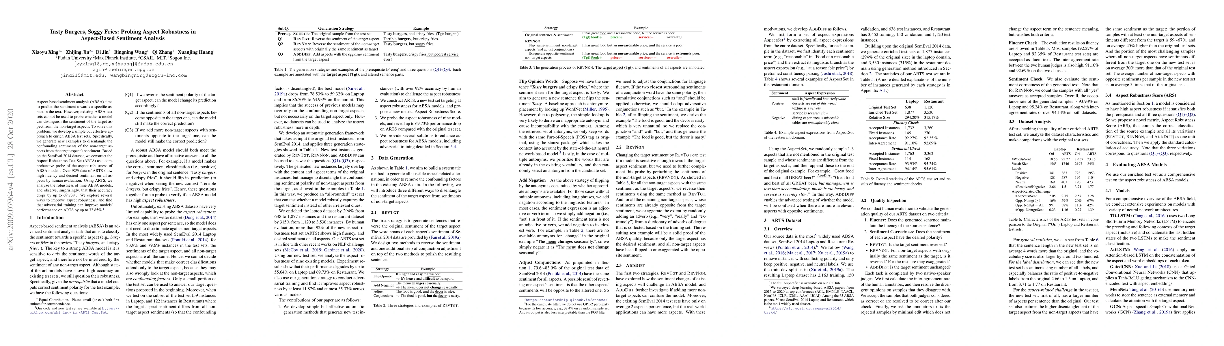Aspect-based sentiment analysis (ABSA) aims to predict the sentiment towards a specific aspect in the text. However, existing ABSA test sets cannot be used to probe whether a model can distinguish the sentiment of the target aspect from the non-target aspects. To solve this problem, we develop a simple but effective approach to enrich ABSA test sets. Specifically, we generate new examples to disentangle the confounding sentiments of the non-target aspects from the target aspect's sentiment. Based on the SemEval 2014 dataset, we construct the Aspect Robustness Test Set (ARTS) as a comprehensive probe of the aspect robustness of ABSA models. Over 92% data of ARTS show high fluency and desired sentiment on all aspects by human evaluation. Using ARTS, we analyze the robustness of nine ABSA models, and observe, surprisingly, that their accuracy drops by up to 69.73%. We explore several ways to improve aspect robustness, and find that adversarial training can improve models' performance on ARTS by up to 32.85%. Our code and new test set are available at https://github.com/zhijing-jin/ARTS_TestSet