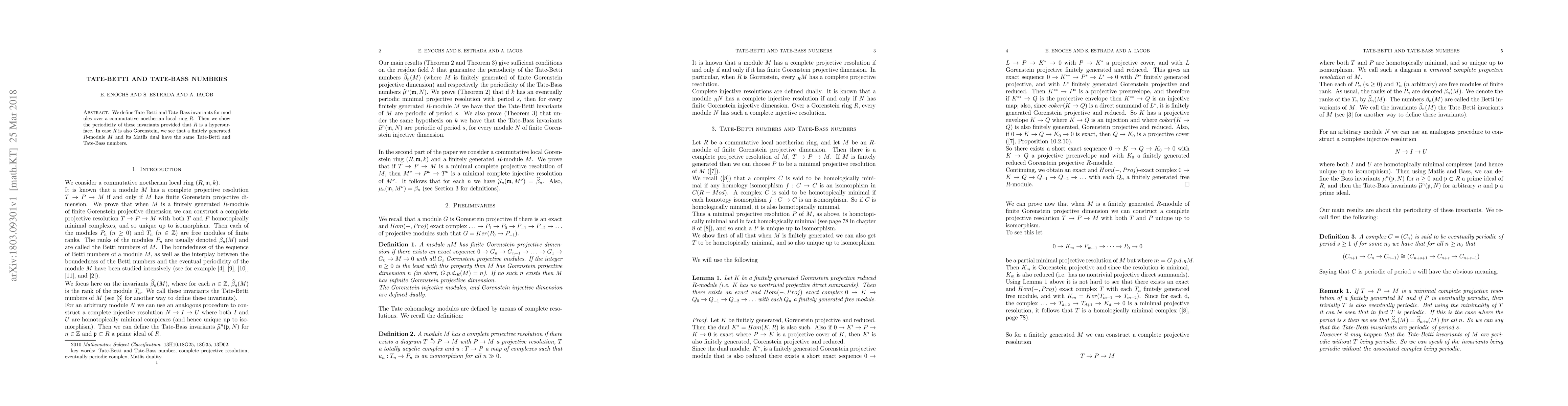 This paper introduces Tate-Betti and Tate-Bass invariants for modules over a commutative noetherian local ring R, demonstrating their periodicity when R is a hypersurface. It further establishes equality in these invariants between a module and its Matlis dual when R is additionally Gorenstein.
