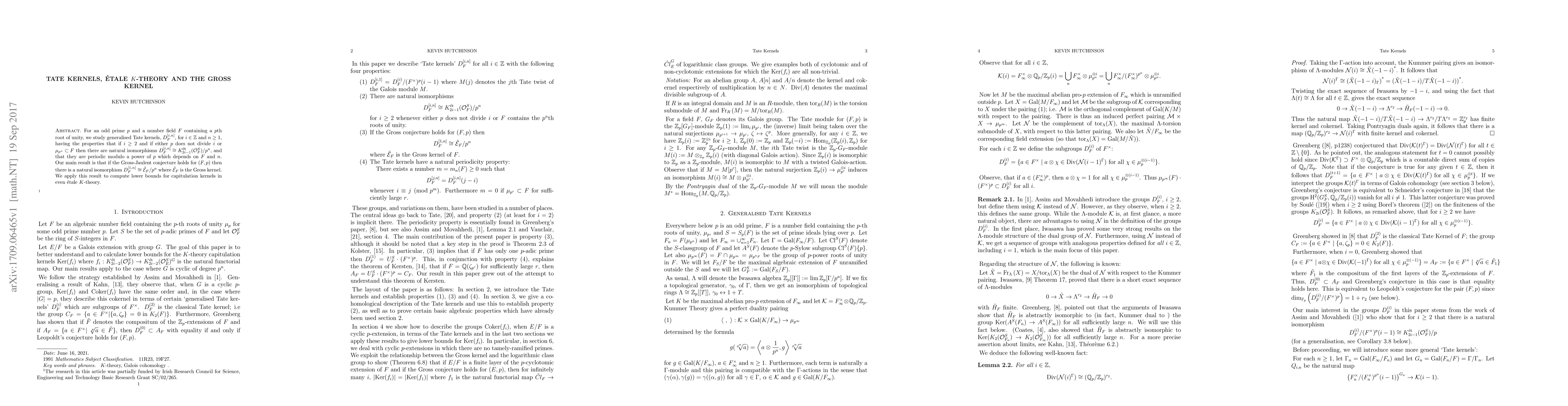 For an odd prime $p$ and a number field $F$ containing a $p$th root of unity, we study generalised Tate kernels, $D_F^{[i,n]}$, for $i\in \mathbb{Z}$ and $n\geq 1$, having the properties that if $i\geq 2$ and if either $p$ does not divide $i$ or $\mu_{p^n}\subset F$ then there are natural isomorphisms $D_F^{[i,n]}\cong K^{\mbox{\tiny \'et}}_{2i-1}(O_F^S)/p^n$, and that they are periodic modulo a power of $p$ which depends on $F$ and $n$. Our main result is that if the Gross-Jaulent conjecture holds for $(F,p)$ then there is a natural isomorphism $D_F^{[i,n]}\cong\mathcal{E}_F/p^n$ where $\mathcal{E}_F$ is the Gross kernel. We apply this result to compute lower bounds for capitulation kernels in even \'etale $K$-theory.