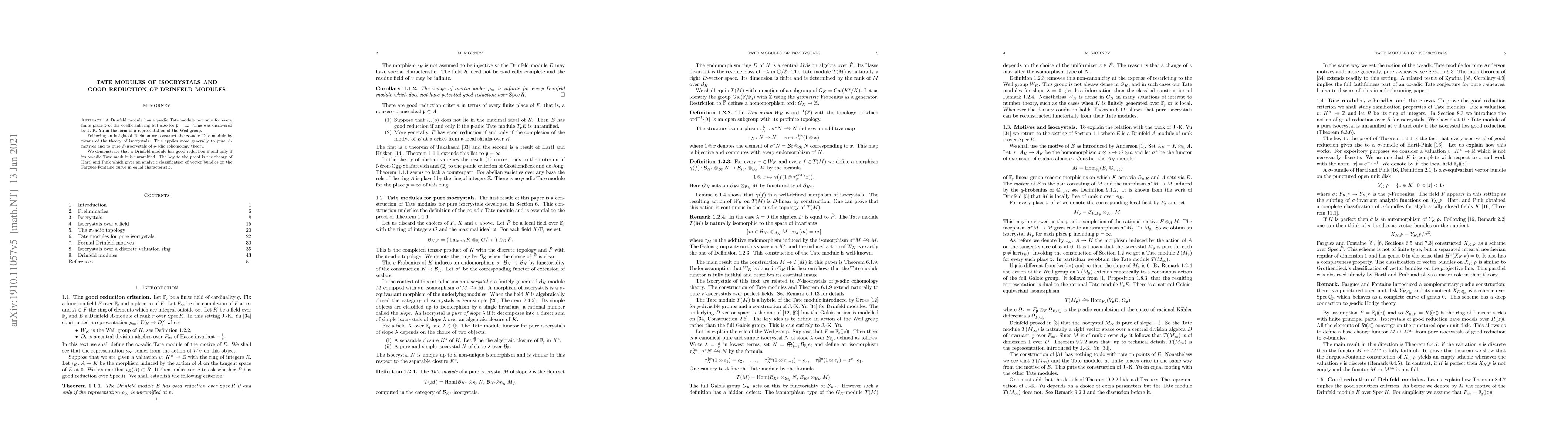 A Drinfeld module has a $\mathfrak{p}$-adic Tate module not only for every finite place $\mathfrak{p}$ of the coefficient ring but also for $\mathfrak{p} = \infty$. This was discovered by J.-K. Yu in the form of a representation of the Weil group. Following an insight of Taelman we construct the $\infty$-adic Tate module by means of the theory of isocrystals. This applies more generally to pure $A$-motives and to pure $F$-isocrystals of $p$-adic cohomology theory. We demonstrate that a Drinfeld module has good reduction if and only if its $\infty$-adic Tate module is unramified. The key to the proof is the theory of Hartl and Pink which gives an analytic classification of vector bundles on the Fargues-Fontaine curve in equal characteristic.