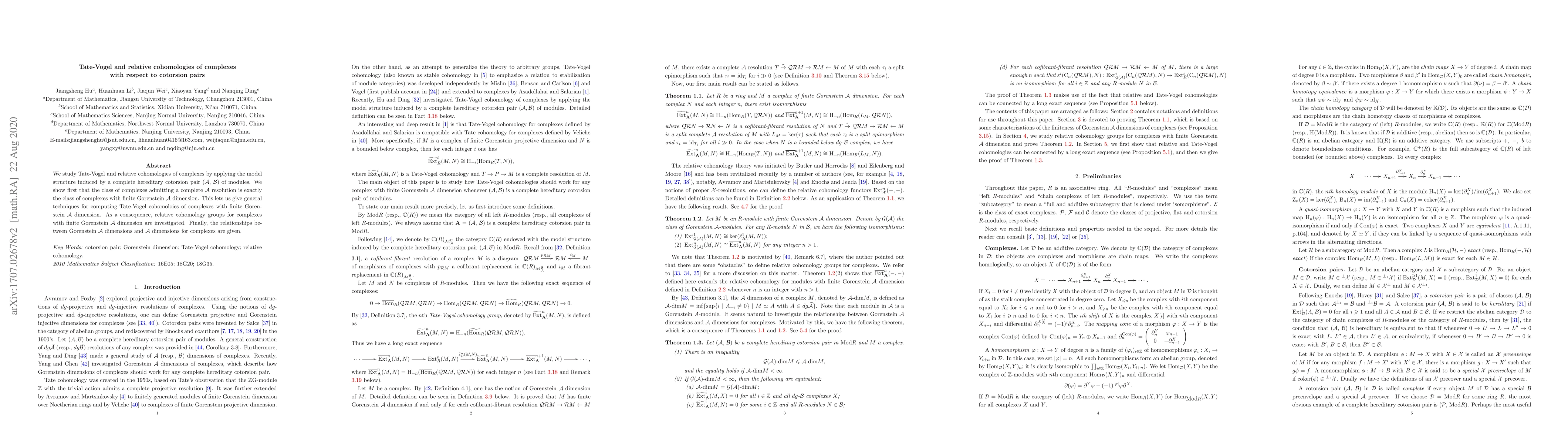 We study Tate-Vogel and relative cohomologies of complexes by applying the model structure induced by a complete hereditary cotorsion pair ($\A$, $\B$) of modules. We show first that the class of complexes admitting a complete $\A$ resolution is exactly the class of complexes with finite Gorenstein $\A$ dimension. This lets us give general techniques for computing Tate-Vogel cohomoloies of complexes with finite Gorenstein $\A$ dimension. As a consequence, relative cohomology groups for complexes with finite Gorenstein $\A$ dimension are investigated. Finally, the relationships between Gorenstein $\A$ dimensions and $\A$ dimensions for complexes are given.