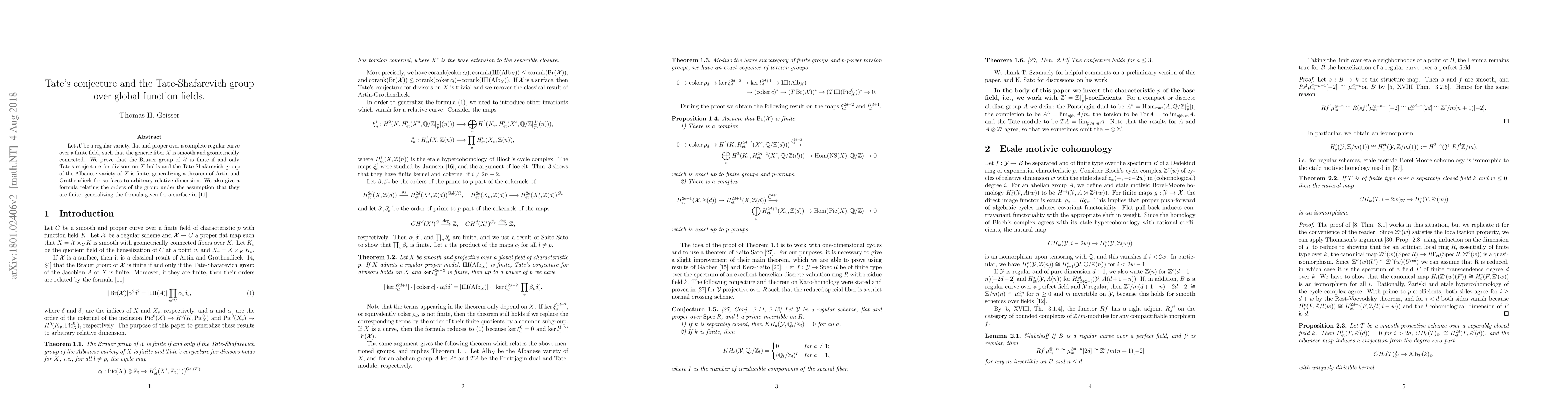 This paper proves that the finiteness of the Brauer group of a regular variety over a global function field is equivalent to the validity of Tate's conjecture for divisors on the generic fiber and the finiteness of the Tate-Shafarevich group of the Albanese variety, extending results from surfaces to higher dimensions. It also provides a formula relating the orders of these groups under finiteness assumptions.