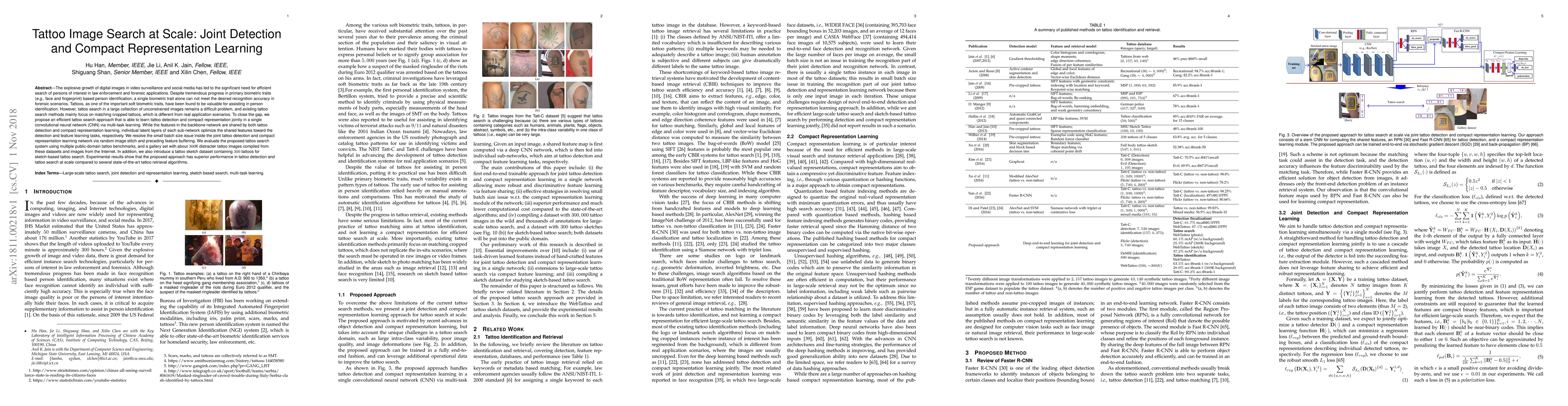This paper proposes an efficient tattoo search method using a joint detection and compact representation learning approach in a single convolutional neural network via multi-task learning. The method addresses the challenges of large-scale tattoo search in unconstrained images and outperforms state-of-the-art algorithms in detection and retrieval tasks.