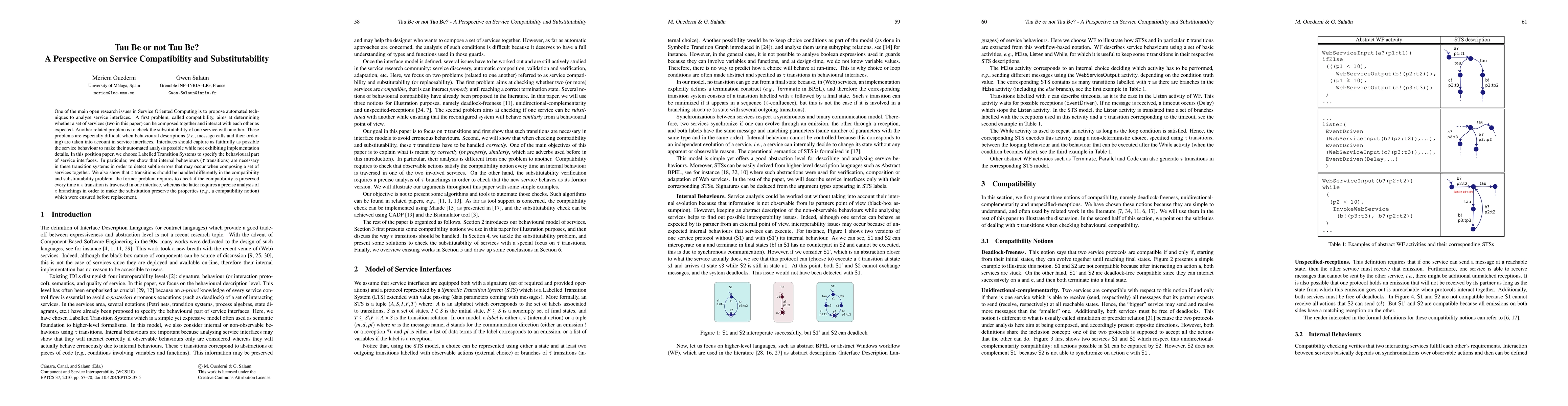 One of the main open research issues in Service Oriented Computing is to propose automated techniques to analyse service interfaces. A first problem, called compatibility, aims at determining whether a set of services (two in this paper) can be composed together and interact with each other as expected. Another related problem is to check the substitutability of one service with another. These problems are especially difficult when behavioural descriptions (i.e., message calls and their ordering) are taken into account in service interfaces. Interfaces should capture as faithfully as possible the service behaviour to make their automated analysis possible while not exhibiting implementation details. In this position paper, we choose Labelled Transition Systems to specify the behavioural part of service interfaces. In particular, we show that internal behaviours (tau transitions) are necessary in these transition systems in order to detect subtle errors that may occur when composing a set of services together. We also show that tau transitions should be handled differently in the compatibility and substitutability problem: the former problem requires to check if the compatibility is preserved every time a tau transition is traversed in one interface, whereas the latter requires a precise analysis of tau branchings in order to make the substitution preserve the properties (e.g., a compatibility notion) which were ensured before replacement.