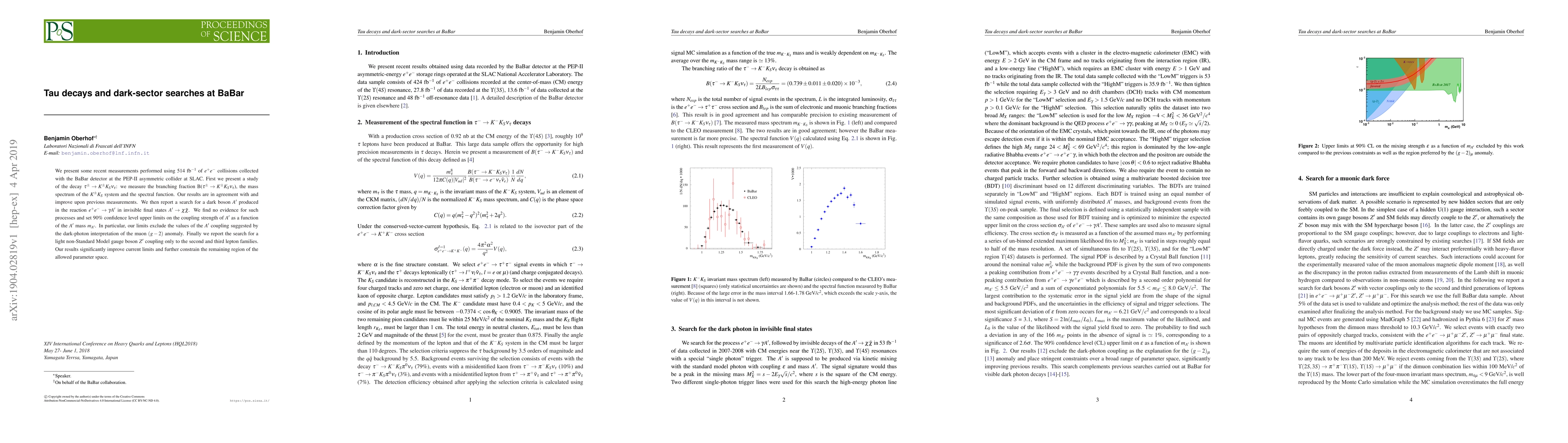 We present some recent measurements performed using 514 fb-1 of $e^+e^-$ collisions collected with the BaBar detector at the PEP-II asymmetric collider at SLAC. First we present a study of the decay tau -> K K_S nu, we measure the branching fraction B(tau -> K K_S nu), the mass spectrum of the K K_S system and obtain the spectral function. Our results are in agreement with and improve previous measurements. We then report a search for a dark boson A' produced in the reaction e+e- -> gamma A' in invisible final states A' -> chi anti-chi . We find no evidence for such processes and set 90% confidence level upper limits on the coupling strength of A' as a function of the A' mass m'. In particular, our limits exclude the values of the A' coupling suggested by the dark-photon interpretation of the muon (g-2) anomaly. Finally we report the search for a light non-Standard Model gauge boson A' coupling only to the second and third lepton families. Our results significantly improve current limits and further constrain the remaining region of the allowed parameter space.